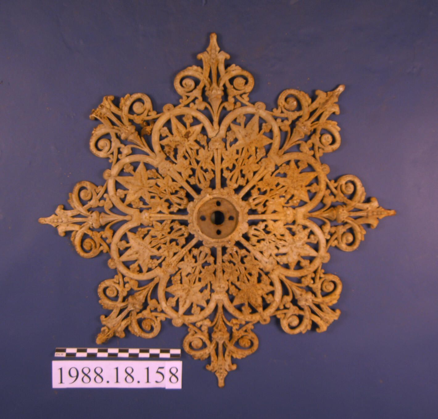 Cast iron elaborate open filigree botanical motif ceiling medallion. Eight point star shaped rosette. Center has series of mounting holes. Painted cream colored. Broken into at least four pieces.