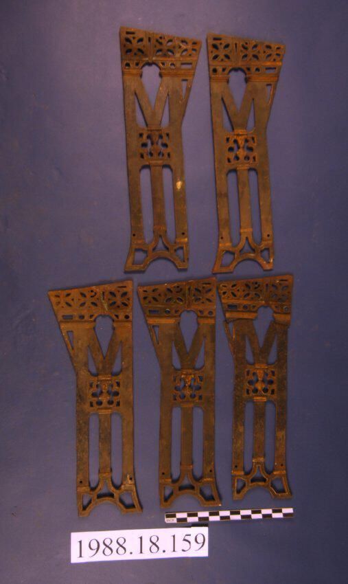 One lot of five cast iron ornaments with open filigree botanical motifs. Painted black with gold colored highlights. Possibly decorative end panels from theater seats. (One is broken).