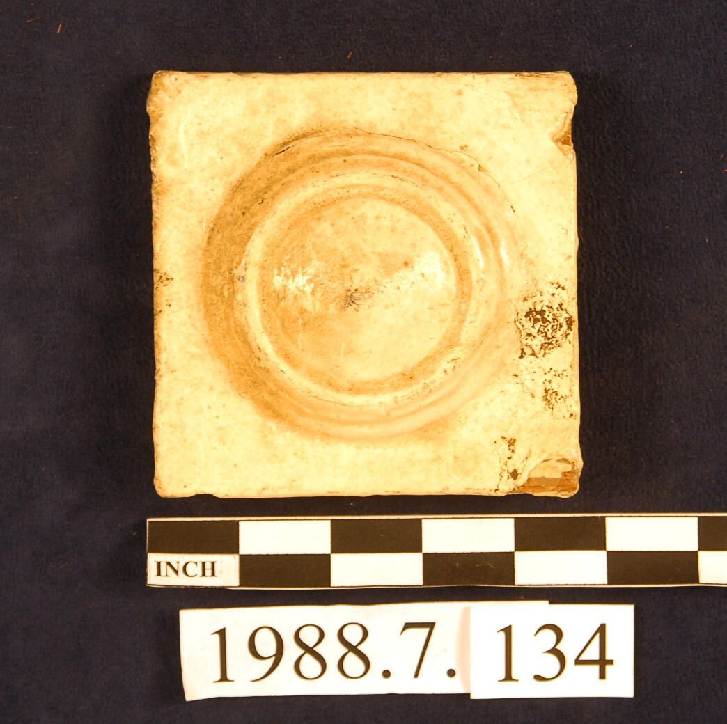 Square corner block. Raised convex bulls eye center. Cedar. Painted. Inscriptions or Markings: Manufacturer: Place of Manufacturer: Design motif: Style: Finish: Painted.