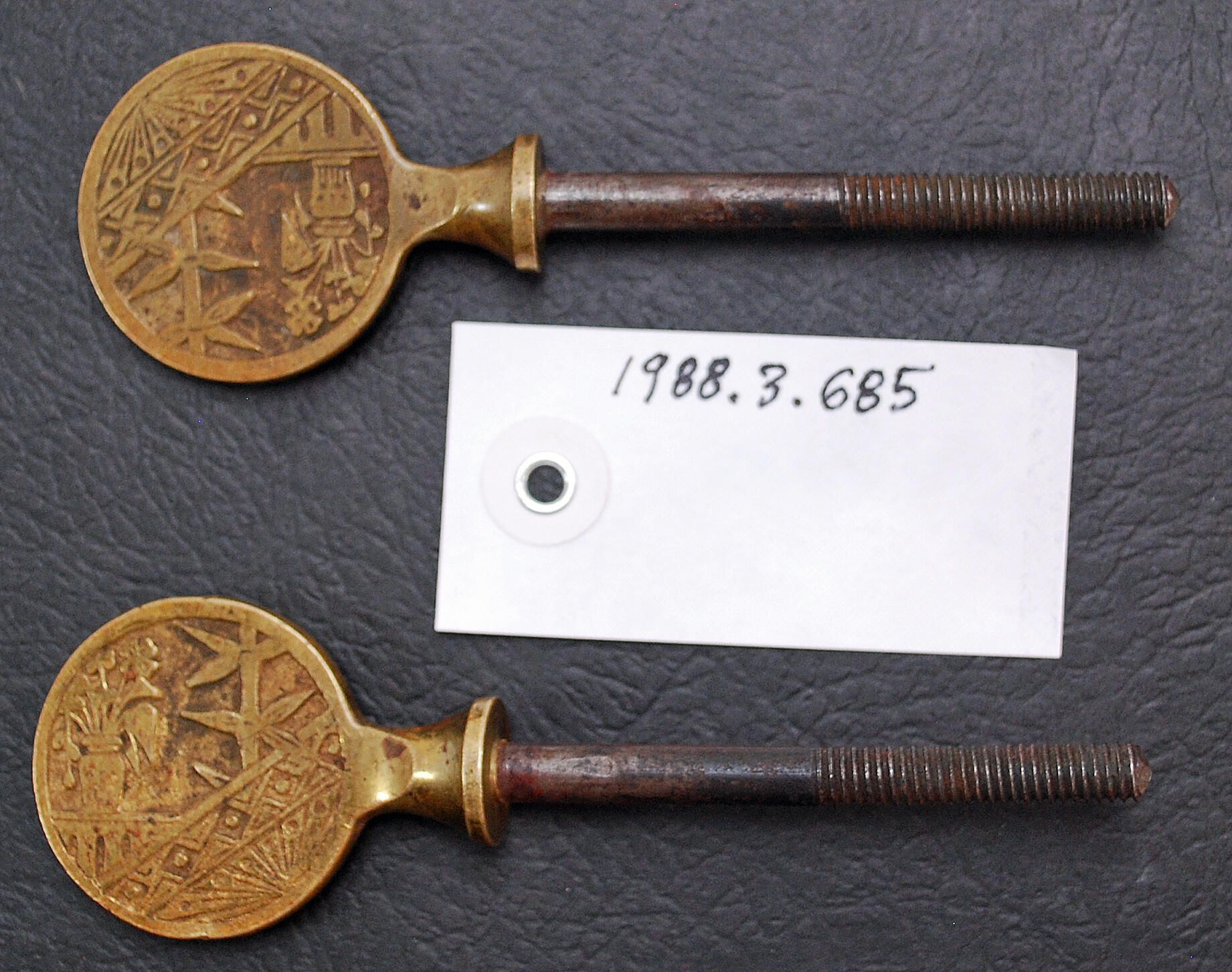 Design Name: Manufacture: Style: Aesthetic Material: Bronze / Steel Manufacturing Method: Cast Surface Finish: Aged / Unpolished VDA Classification: VDA Number: . Shape: Patent Specifics: Lock Type (If Applicable): Inscription/Makers Mark: Inscription Text: Comments: Threaded Steel Shank on Each.