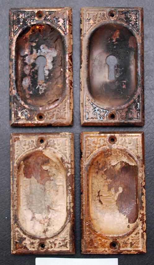 Comments: Apparently Matches Pocket Door Lock. includes Two Recessed Escutcheons with Key Holes, and Two Without. Later Painted / Burned. Escutcheons Found in Same Box as Set of Corbin Mortise Locks,l Knobs and Escutcheons. Presumed to be From Same Building.Lexicon