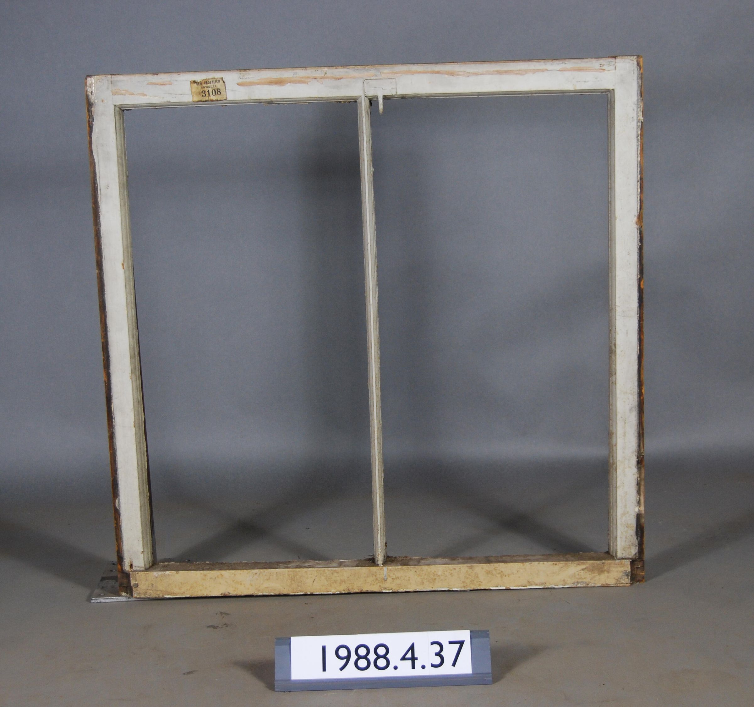Rectangular. Mortice and tenon and dovetail joints. Dual opening. Glass panes missing. Vertical muntin. Brass loop hardware at top.