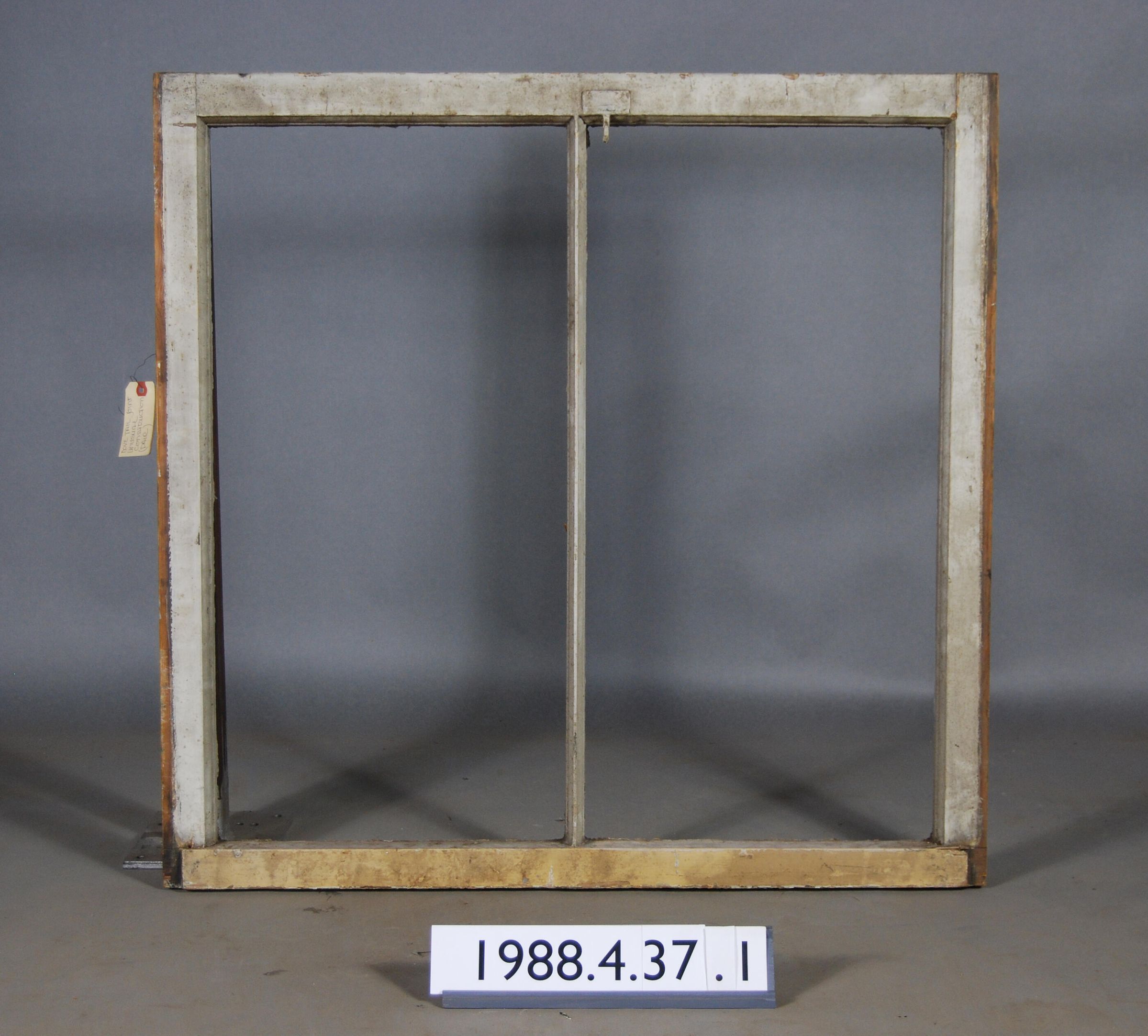 Rectangular. Mortice and tenon and dovetail joints. Dual pane openings. Glass panes missing. Vertical muntin. Brass loop hardware at top sash.
