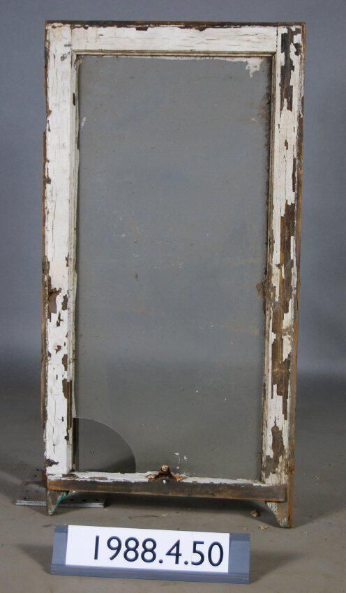 Rectangular. Mortice and tenon and coped joints. Broken glass pane. Has iron latch hardware. Ogee lugs. Type: Double hung top sash. Inscriptions or Markings: Manufacturer: Place of Manufacturer: Design motif: Style: Finish: Painted.