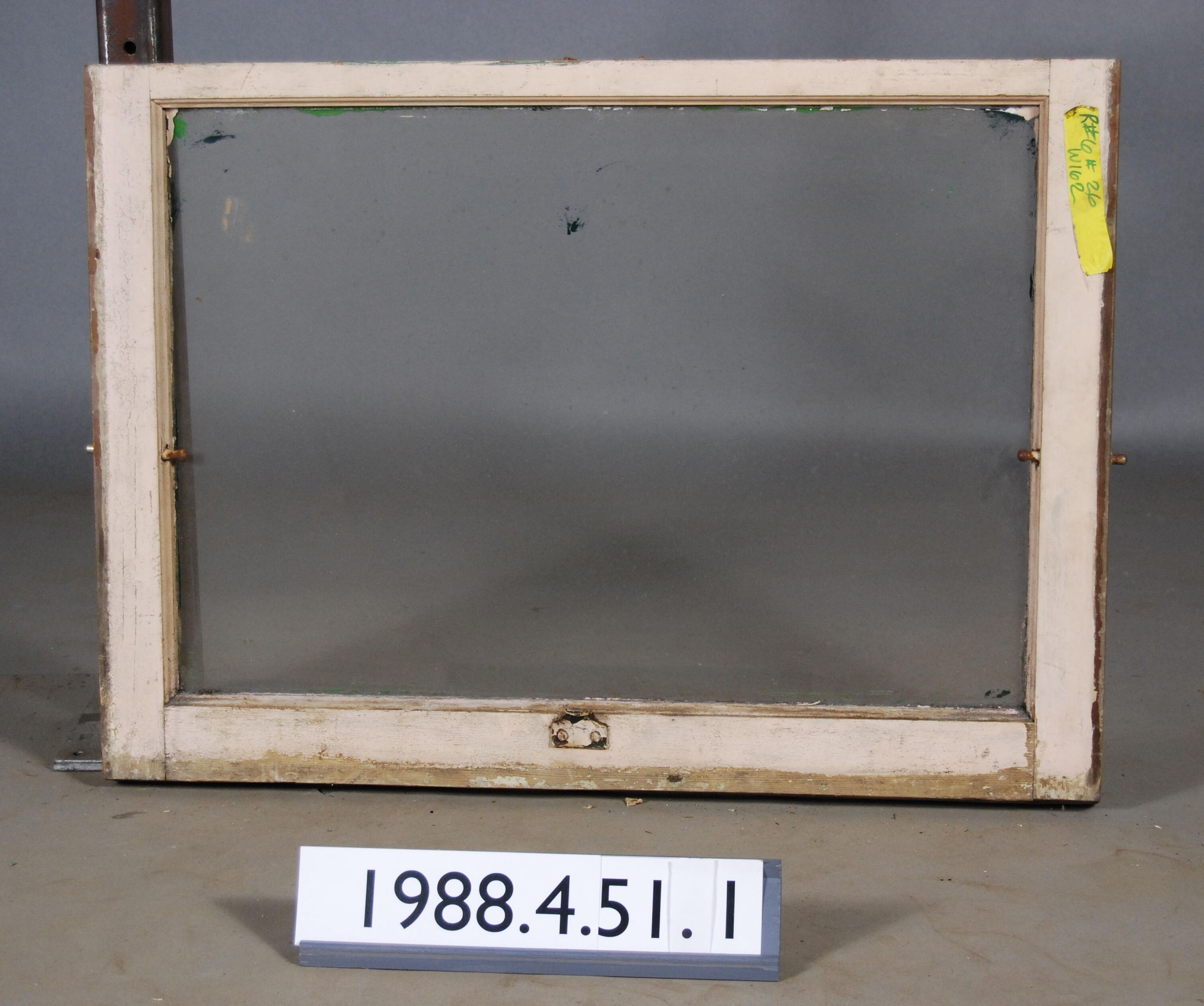 Rectangular. Mortice and tenon joints. Complete glass pane. Has two spring bolts and one tab lift handle. Latch hardware missing.