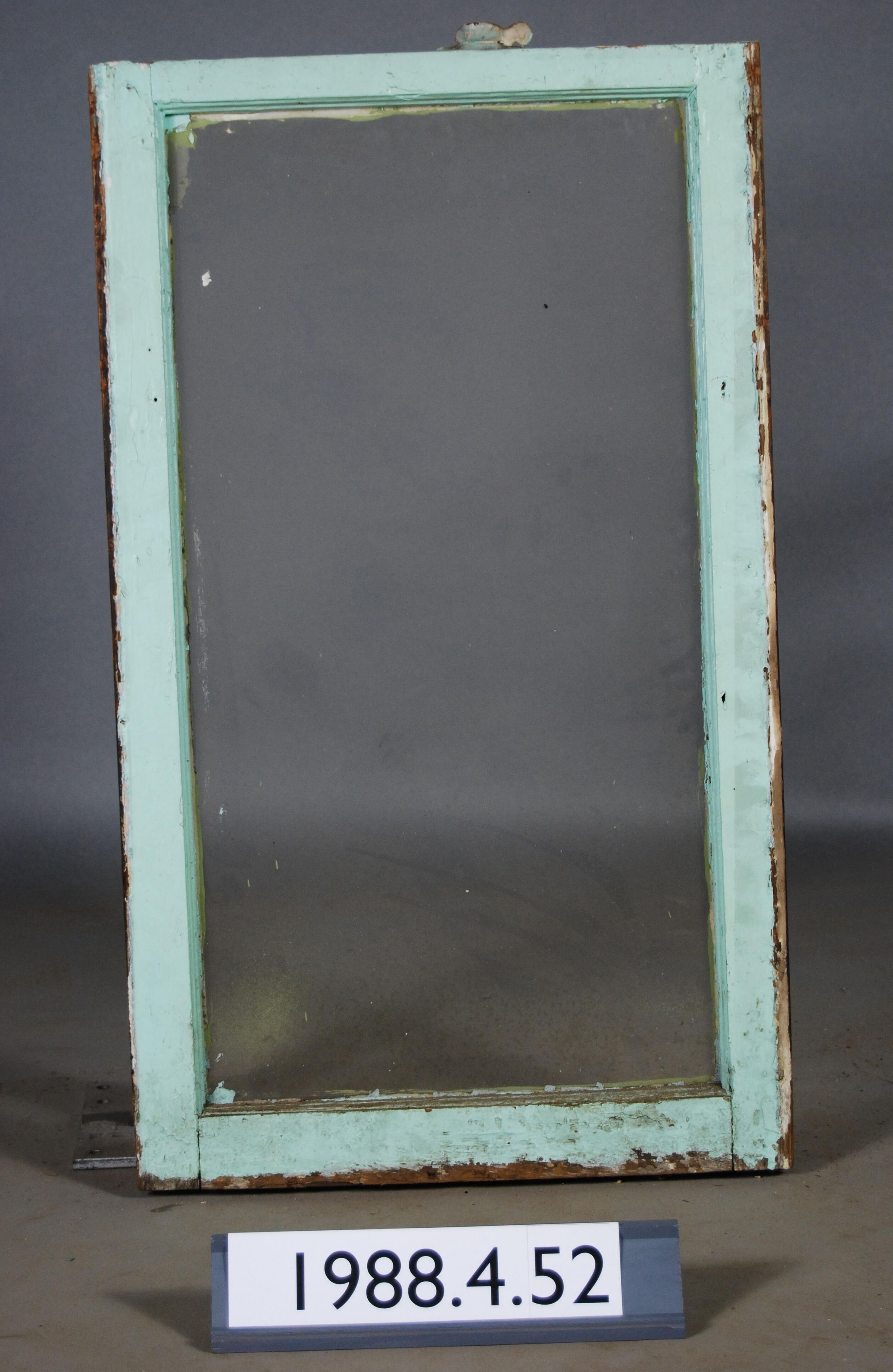 Rectangular. Mortice and tenon and coped joints. Complete glass pane. Has latch hardware. Type: Double hung bottom sash. Inscriptions or Markings: Manufacturer: Place of Manufacturer: Design motif: Style: Finish: Painted.