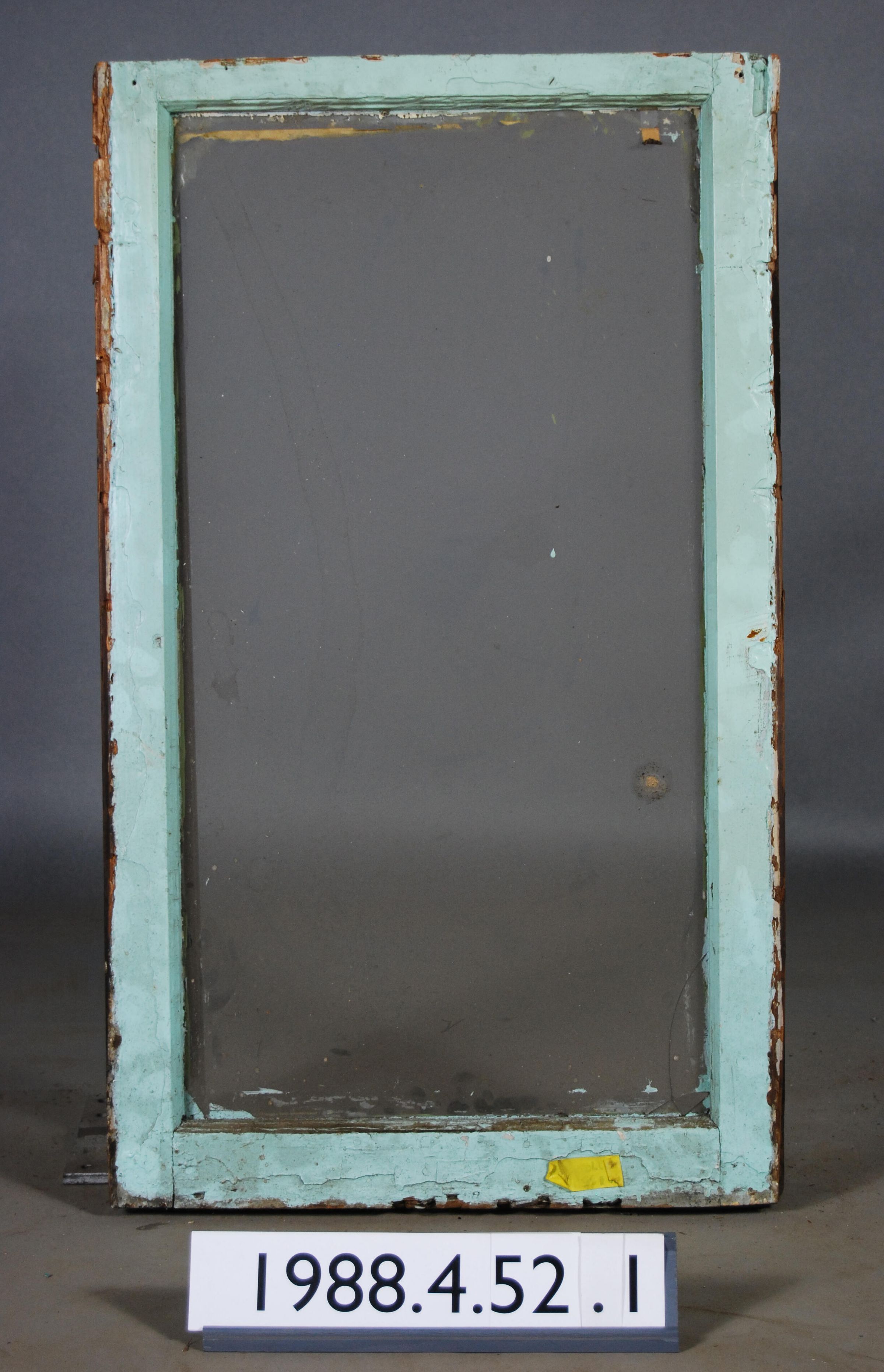 Rectangular. Mortice and tenon and coped joints. Complete glass pane. Has latch hardware. Type: Double hung bottom sash. Inscriptions or Markings: Manufacturer: Place of Manufacturer: Design motif: Style: Finish: Painted.