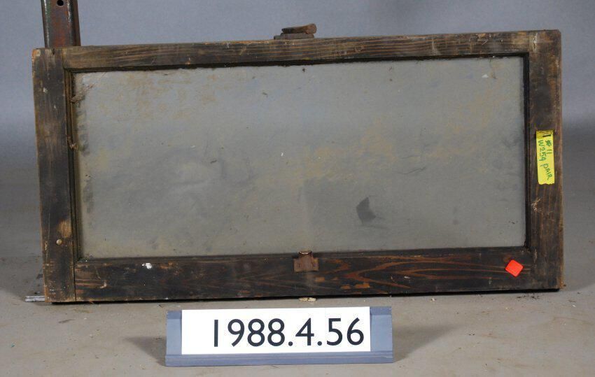 Rectangular. Mortice and tenon joints. Complete glass pane. Has latch hardware and tab lift handle. Type: Double hung bottom sash. Inscriptions or Markings: Manufacturer: Place of Manufacturer: Design motif: Style: Finish: Painted.