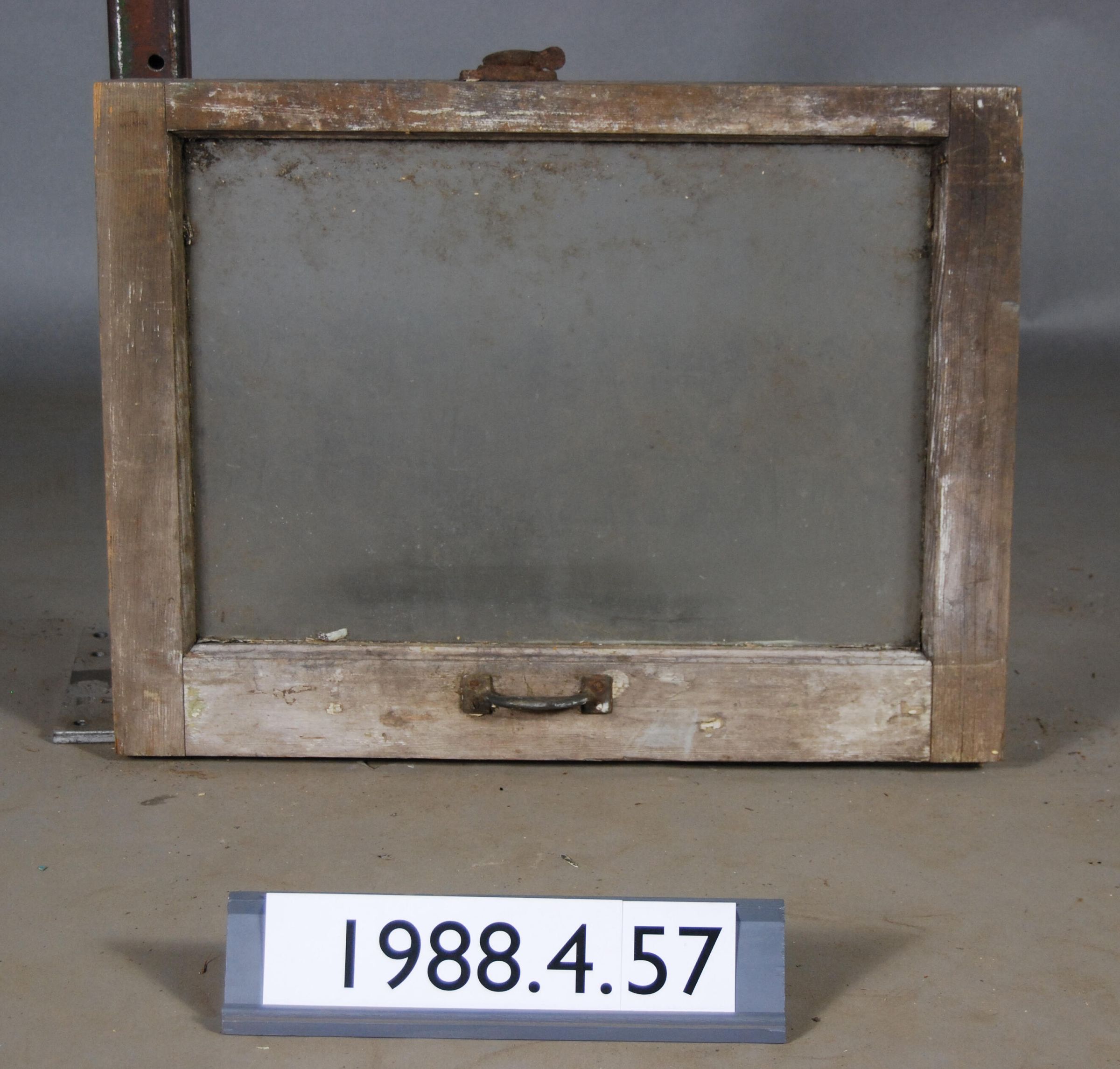 Rectangular. Mortice and tenon and coped joints. Complete glass pane. Has latch hardware and handle. Type: Double hung bottom sash. Inscriptions or Markings: Manufacturer: Place of Manufacturer: Design motif: Style: Finish: Painted.