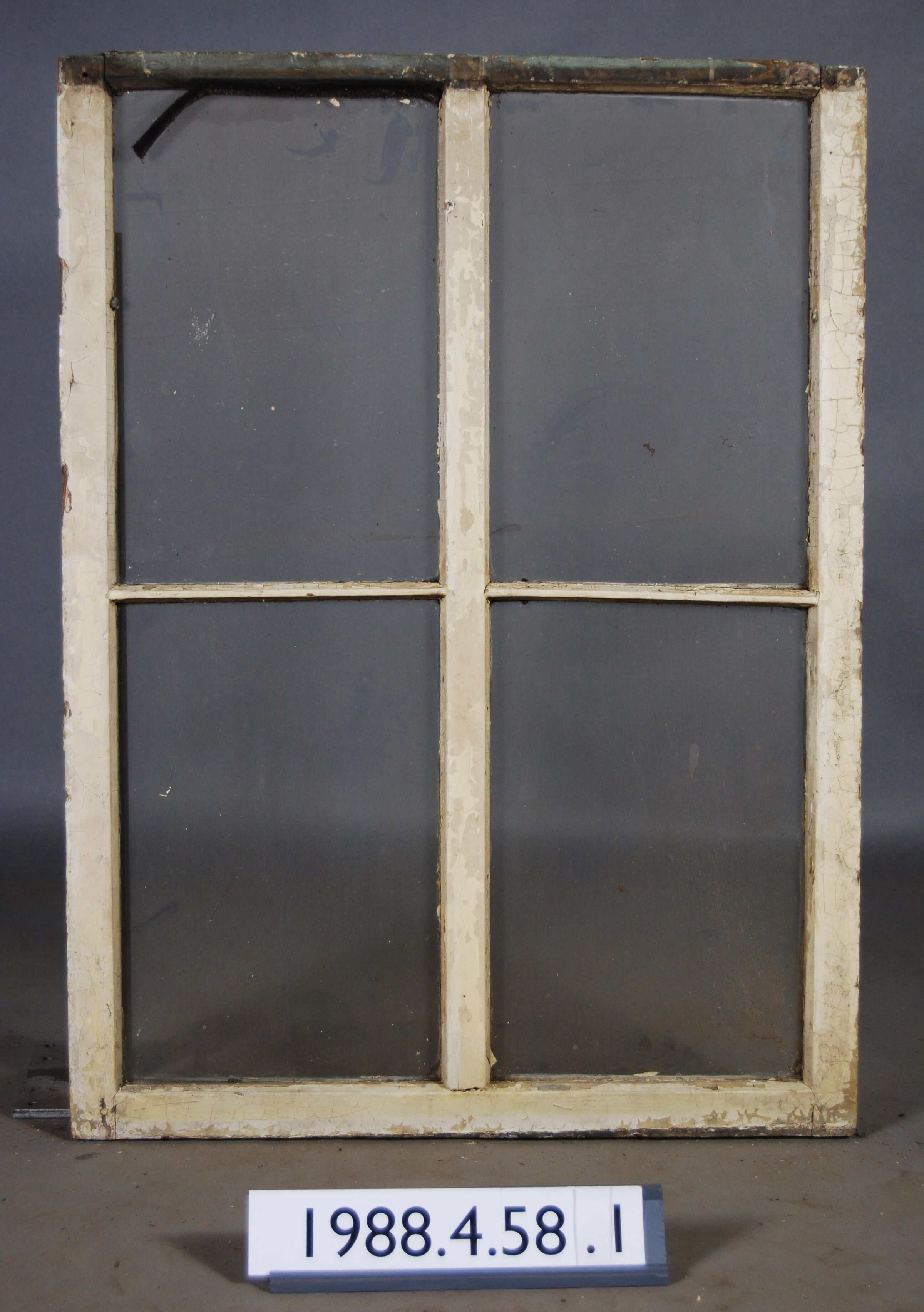 Rectangular. Mortice and tenon and coped joints. Four openings with three complete glass panes. One broken pane. Spring bolts missing.