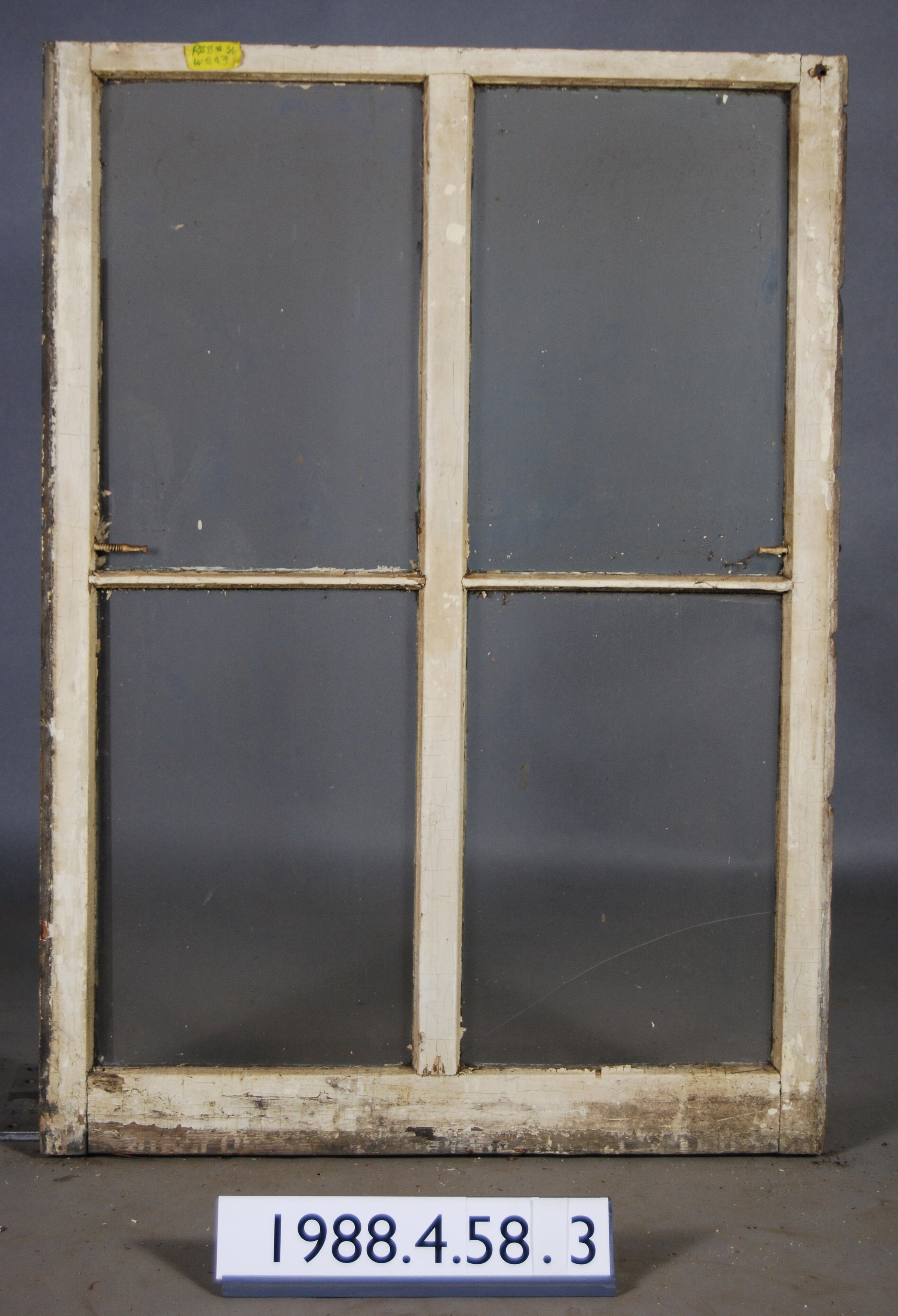 Rectangular. Mortice and tenon and coped joints. Segmented four openings with three complete glass panes. One broken pane. Has two spring bolts.