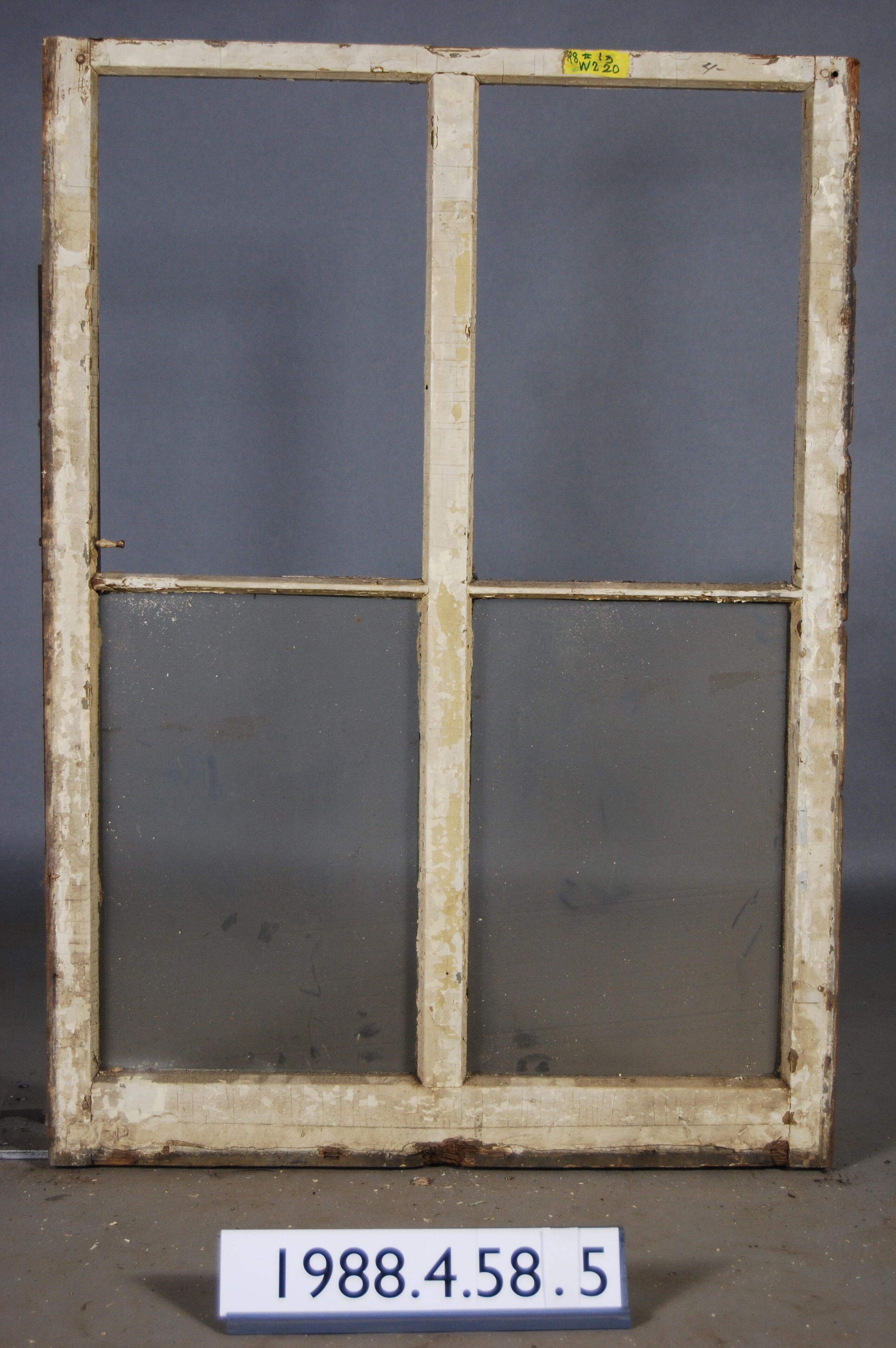 Rectangular. Mortice and tenon and coped joints. Segmented four openings with two complete glass panes and two missing pane. Has one spring bolt. Other bolt is missing.