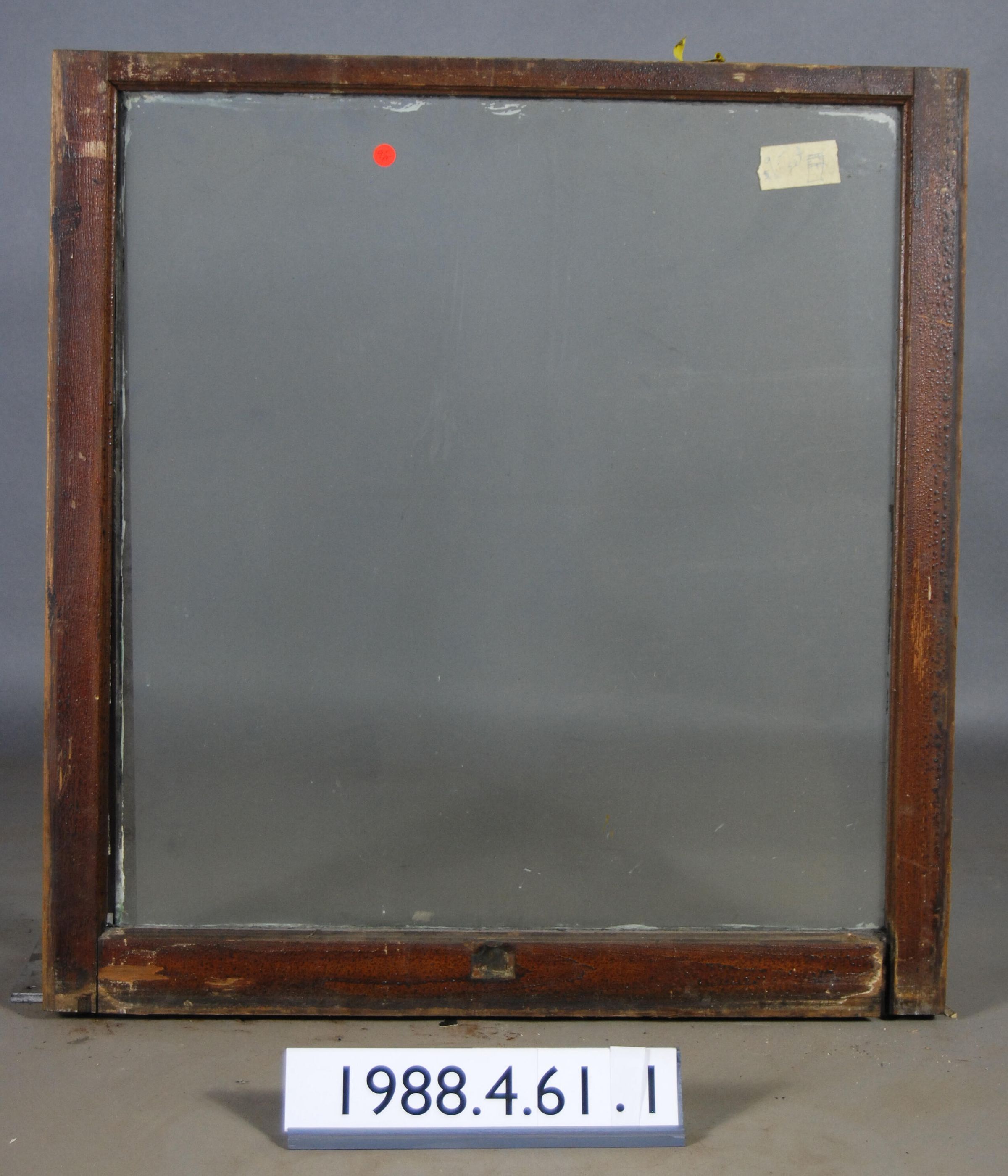Rectangular. Mortice and tenon joints. Complete glass pane. Latch hardware missing. Has tab lift handle. Type: Double hung bottom sash. Inscriptions or Markings: Manufacturer: Place of Manufacturer: Design motif: Style: Finish: Painted / Varnished.