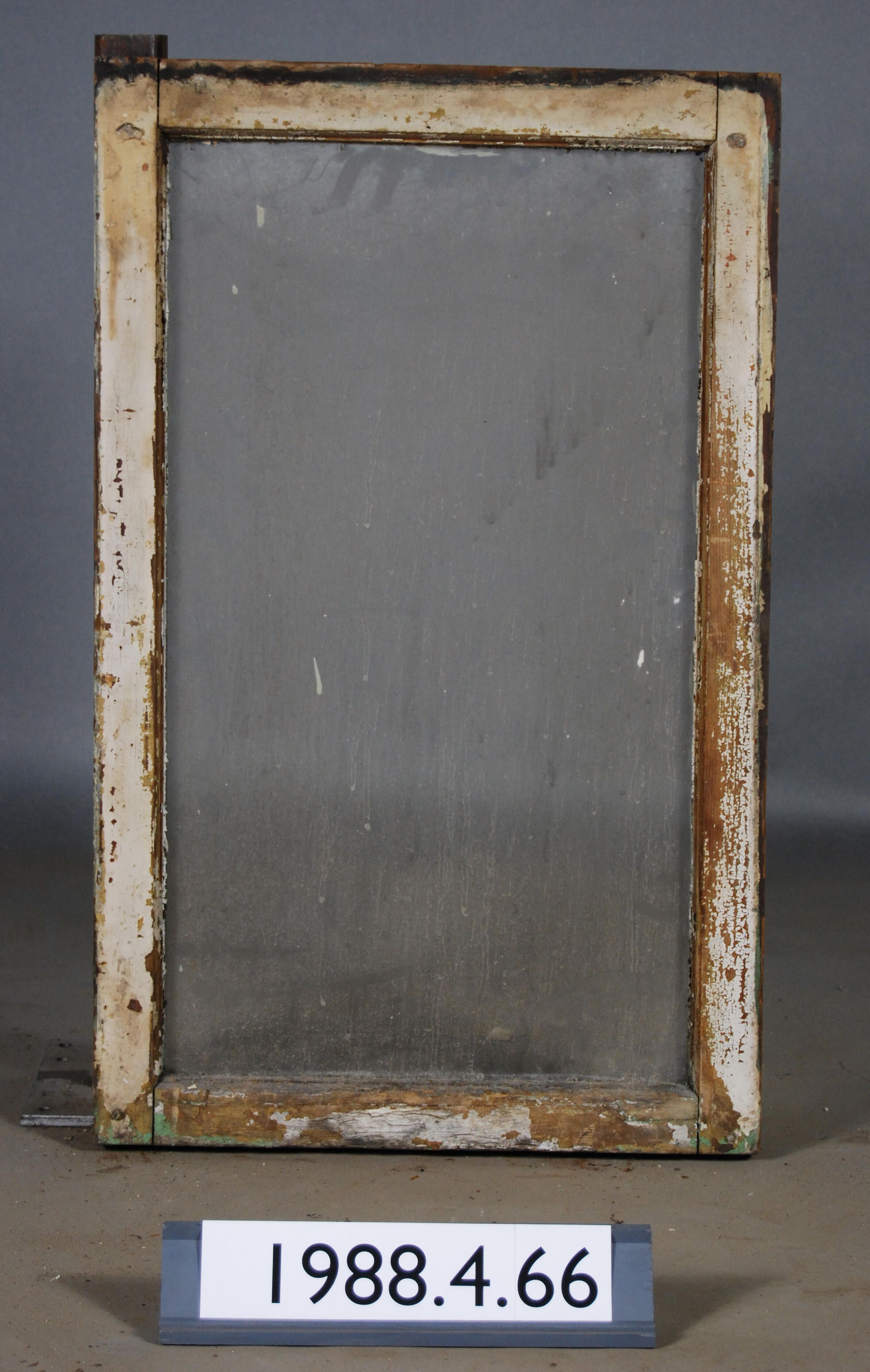 Rectangular. Mortice and tenon and coped joints. Complete glass pane. Hardware missing. Type: .Double hung bottom sash. Inscriptions or Markings: Manufacturer: Place of Manufacturer: Design motif: Style: Finish: Painted.
