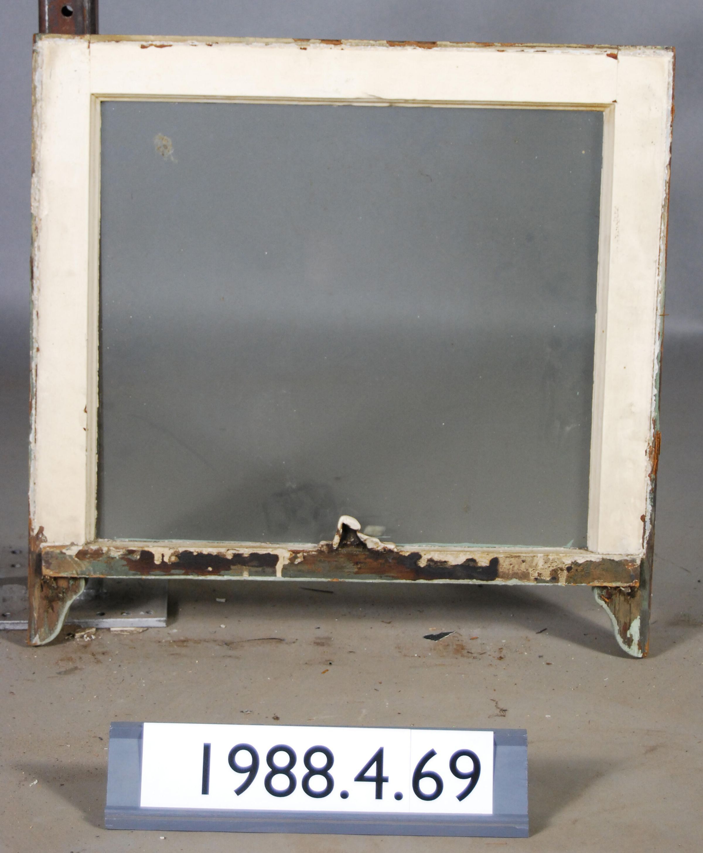 Rectangular. Mortice and tenon and coped joints. Complete glass pane. Has latch hardware. Ogee lugs. Type: .Double hung top sash. Inscriptions or Markings: Manufacturer: Place of Manufacturer: Design motif: Style: Finish: Painted.