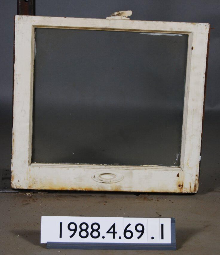 Rectangular. Mortice and tenon joints. Complete glass pane. Has latch hardware and recessed lift handle. Type: .Double hung bottom sash. Inscriptions or Markings: Manufacturer: Place of Manufacturer: Design motif: Style: Finish: Painted.