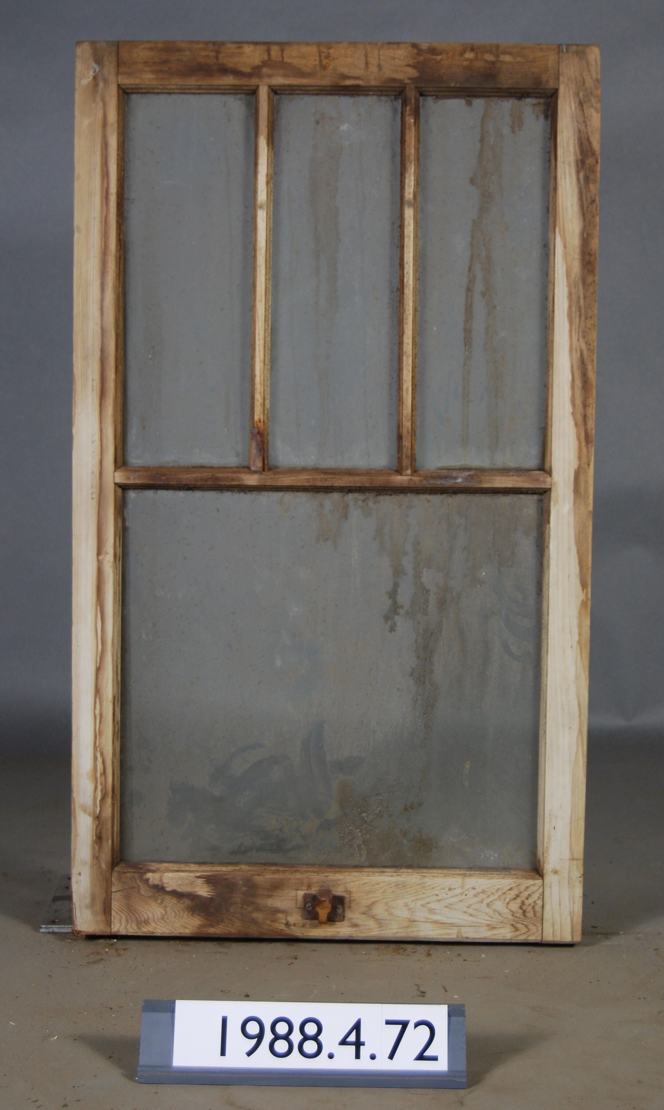 Rectangular. Mortice and tenon and coped joints. Three smaller openings with complete glass panes over one opening with complete glass pane. Spring latch and tab lift handle.