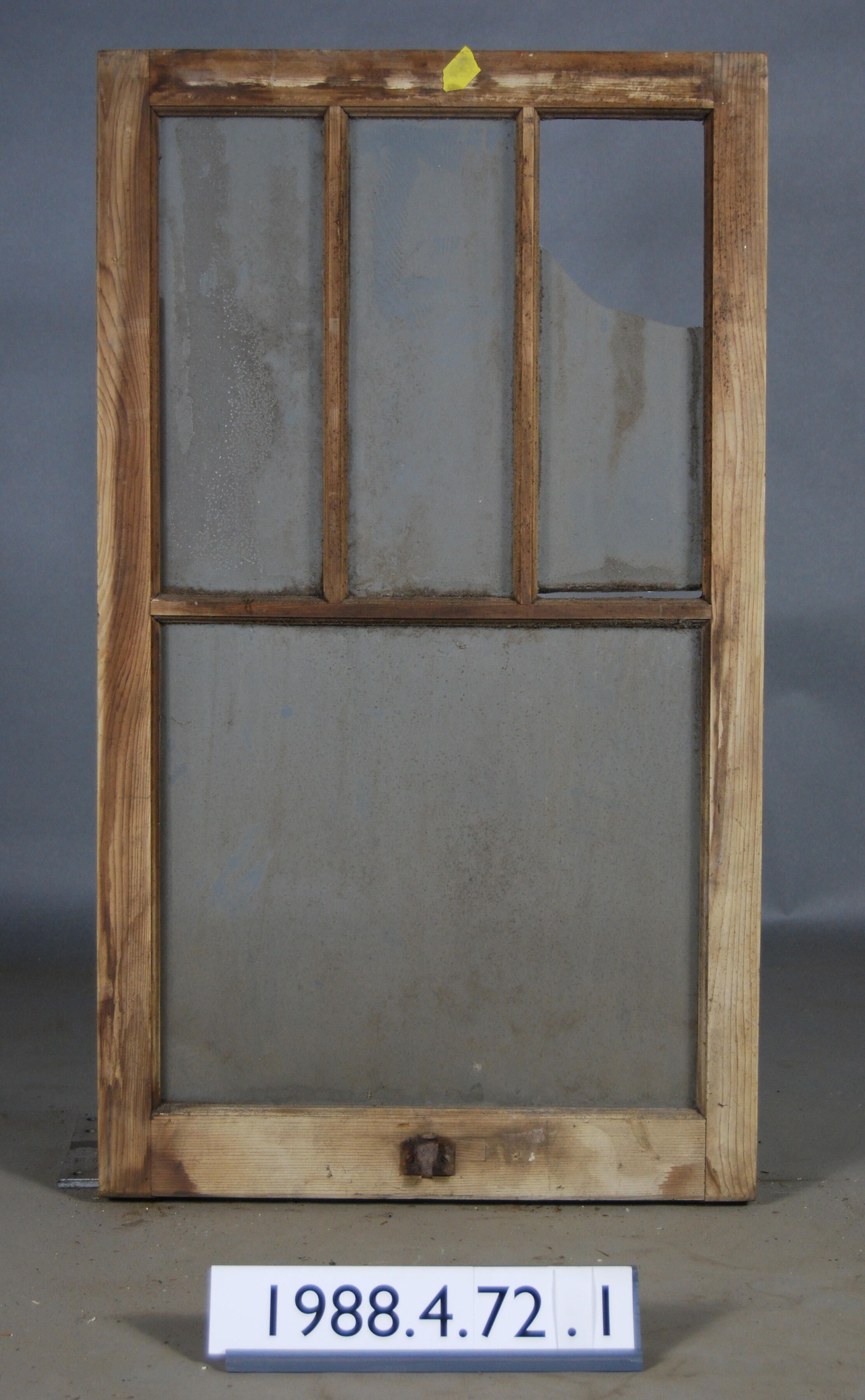 Rectangular. Mortice and tenon and coped joints. Three smaller openings (two complete - one broken) over one opening with complete glass pane. Spring latch and tab lift handle.