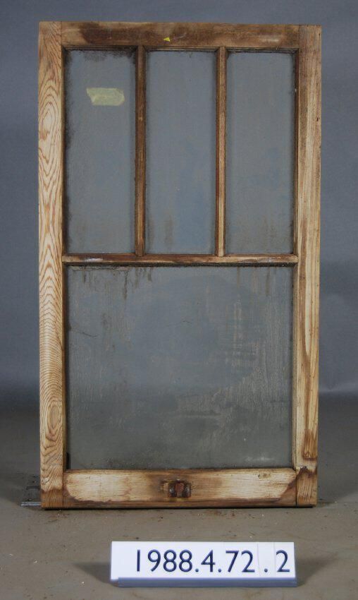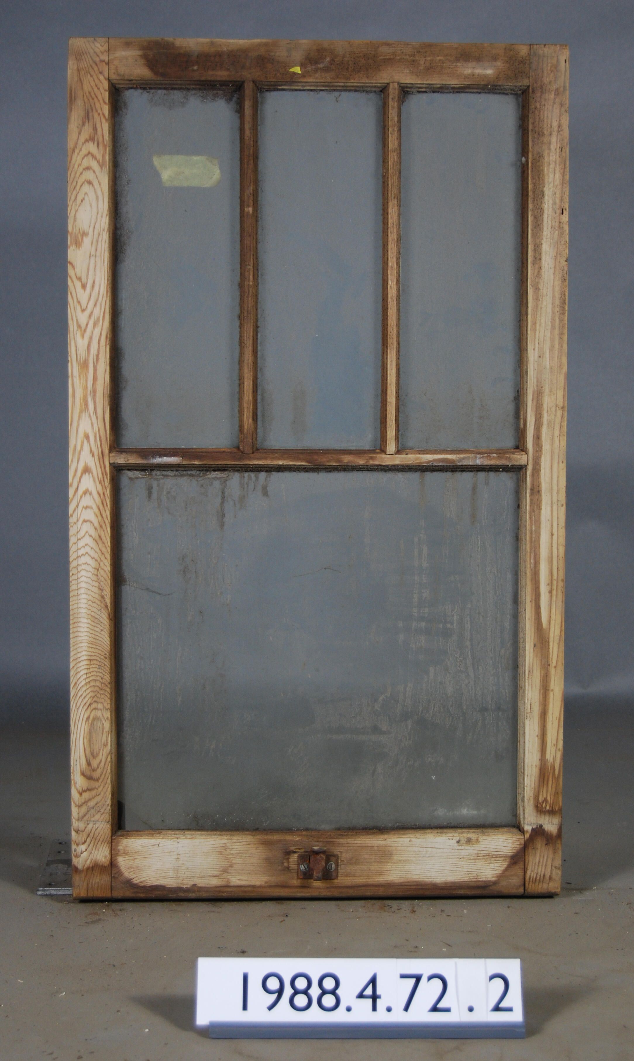 Rectangular. Mortice and tenon and coped joints. Three smaller openings with complete glass panes over one opening with complete glass pane. Spring latch and tab lift handle.