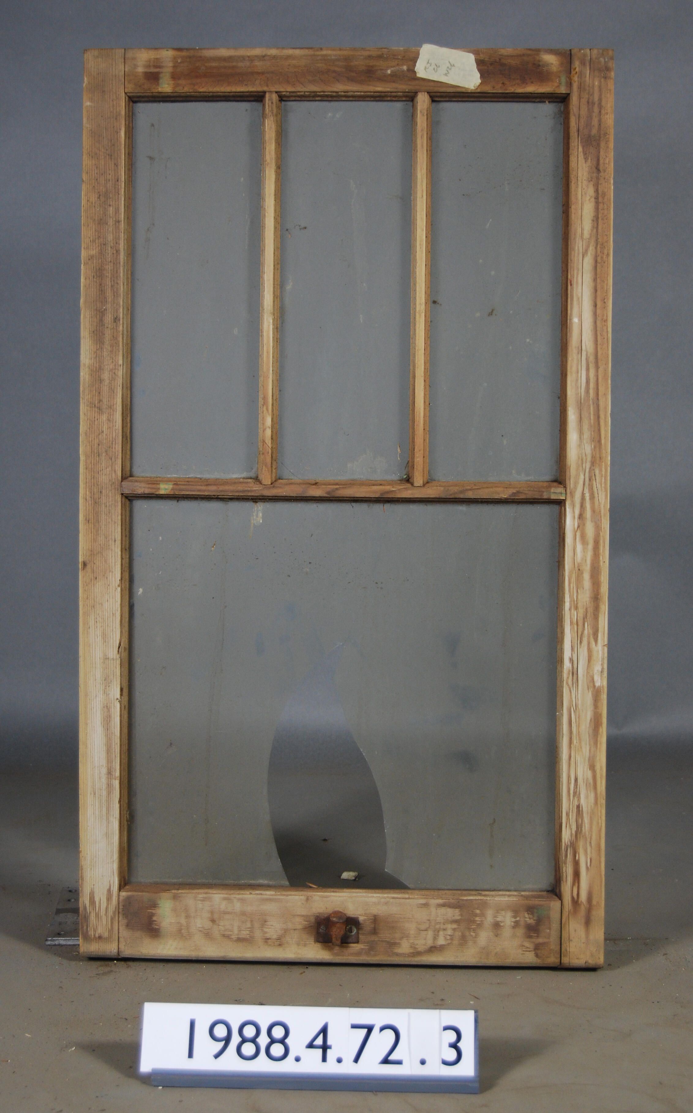 Rectangular. Mortice and tenon and coped joints. Three smaller openings with complete glass panes over one opening with broken glass pane. Spring latch and tab lift handle.