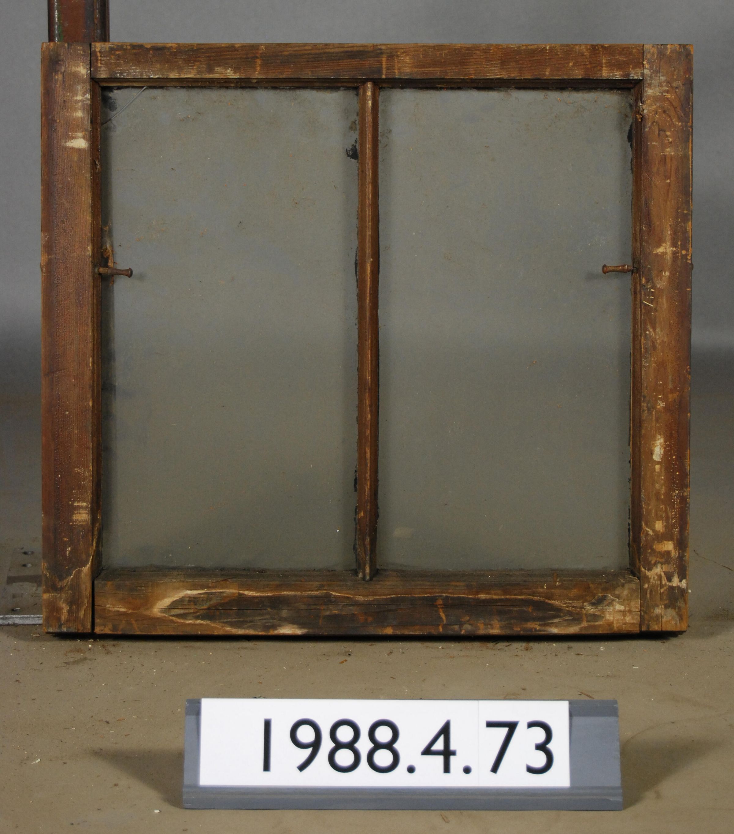 Rectangular. Mortice and tenon and coped joints. Side by side dual openings. One complete pane. One broken pane. Two sliding bolts.