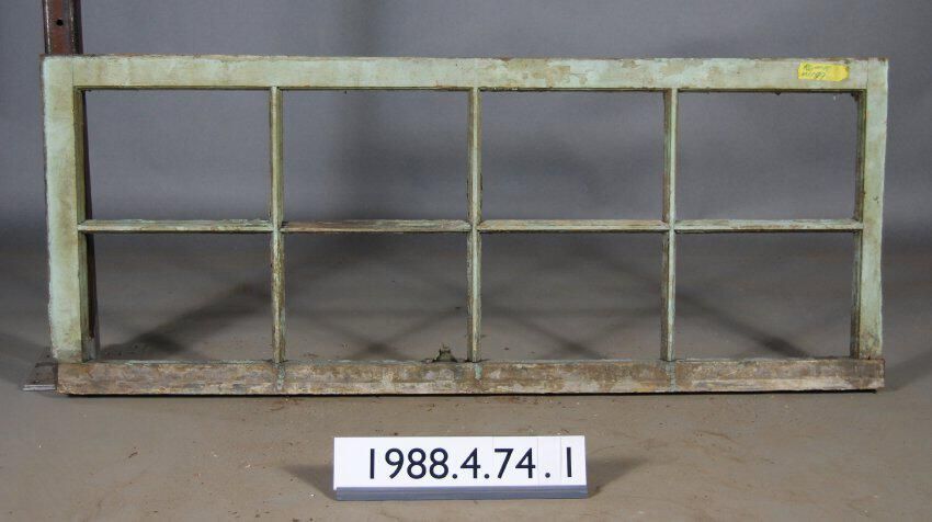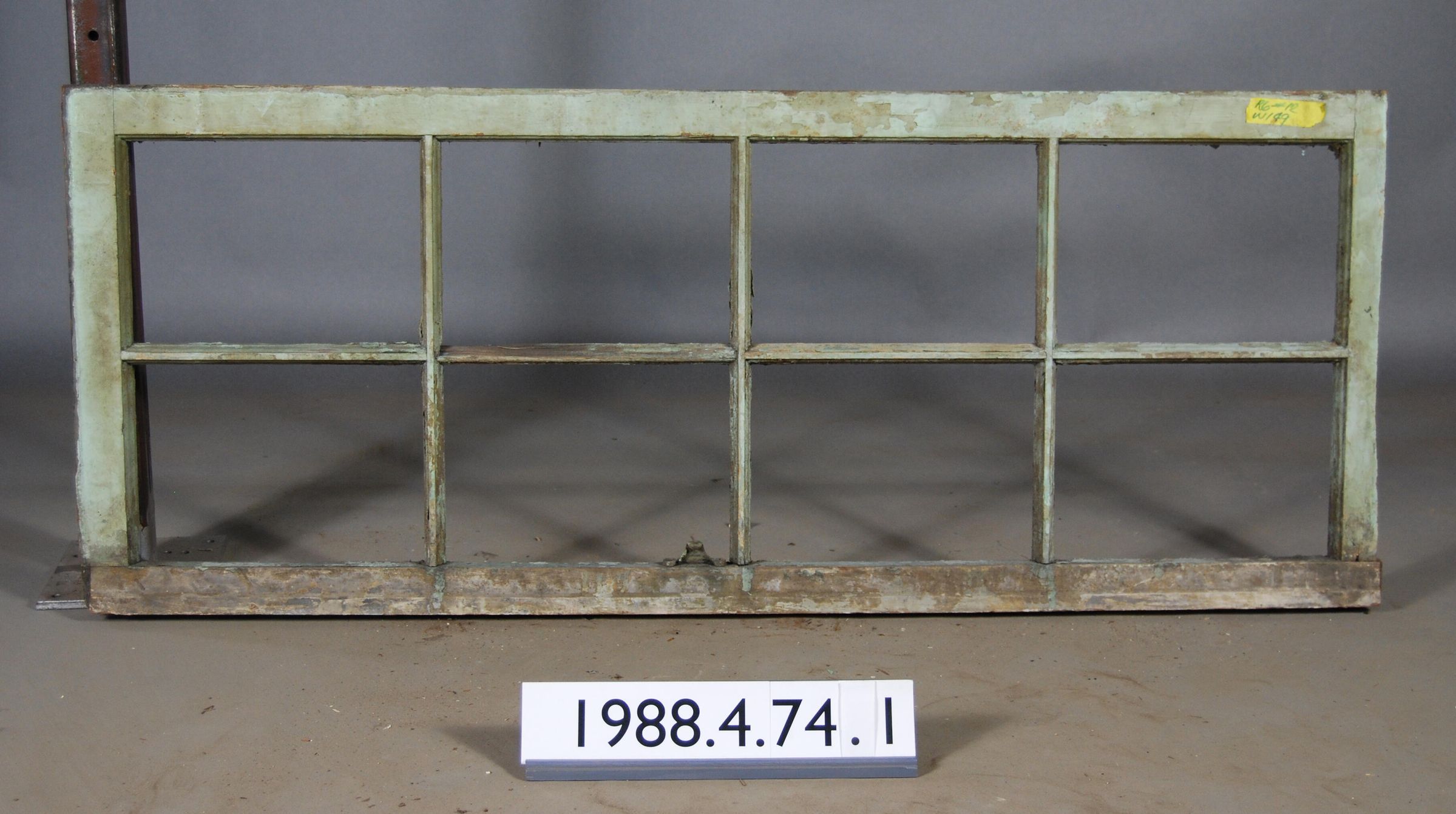 Rectangular. Mortice and tenon and coped joints. Eight openings. Originally with molded clear glass. All panes broken. Iron latch hardware. Type: .Double hung top sash. Inscriptions or Markings: Manufacturer: Place of Manufacturer: Design motif: Style: Finish: Painted.