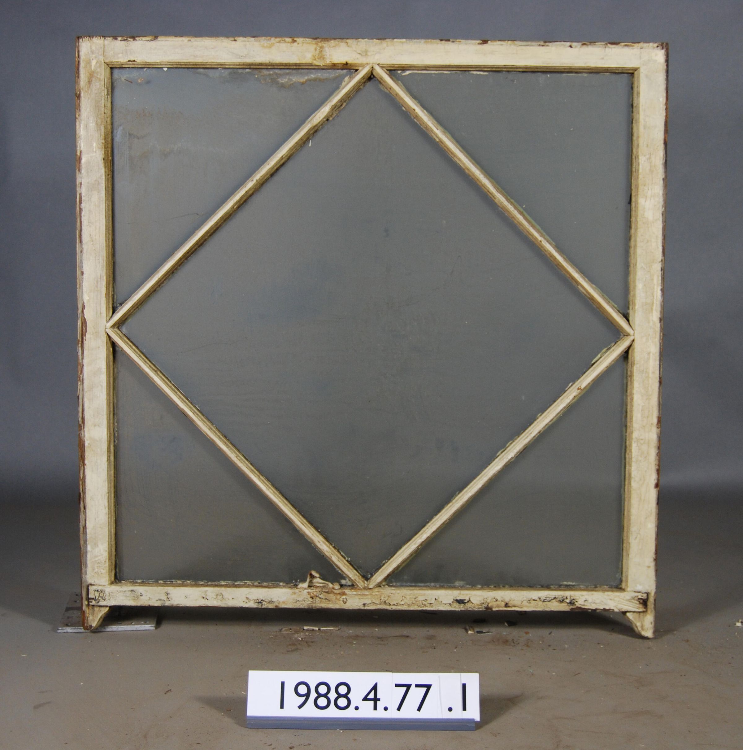 Rectangular. Mortice and tenon and coped joints. Five openings. Central diamond shaped pane with four corner triangular panes. All complete glass. Iron latch hardware. Molded ogee lugs.