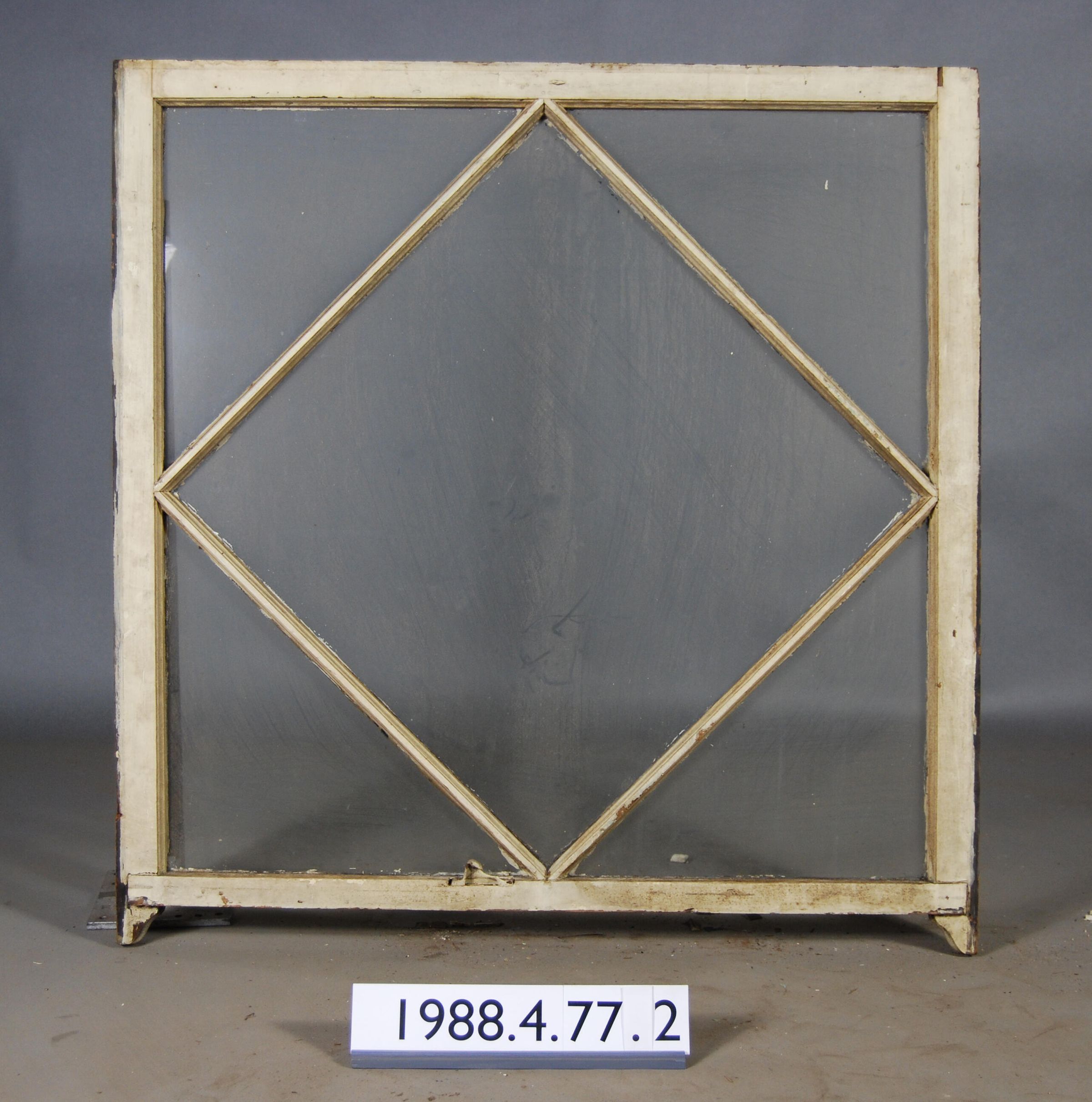 Rectangular. Mortice and tenon and coped joints. Five openings. Central diamond shaped pane with four corner triangular panes. All complete glass. Iron latch hardware. Molded ogee lugs.