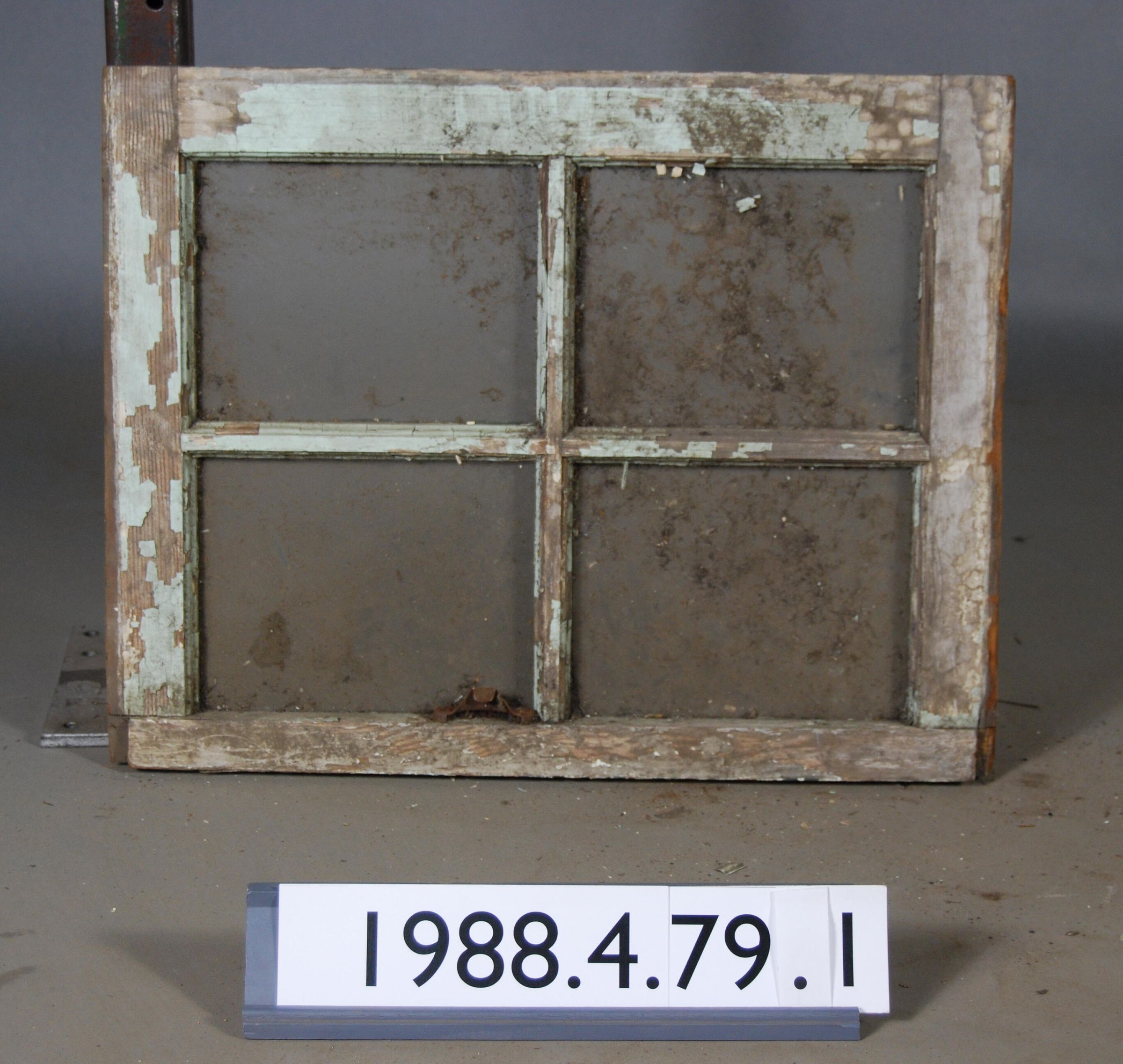 Rectangular. Mortice and tenon and coped joints. Four openings with complete glass panes. Iron latch hardware. Type: .Double hung top sash.. Inscriptions or Markings: Manufacturer: Place of Manufacturer: Design motif: Style: Finish: Painted.
