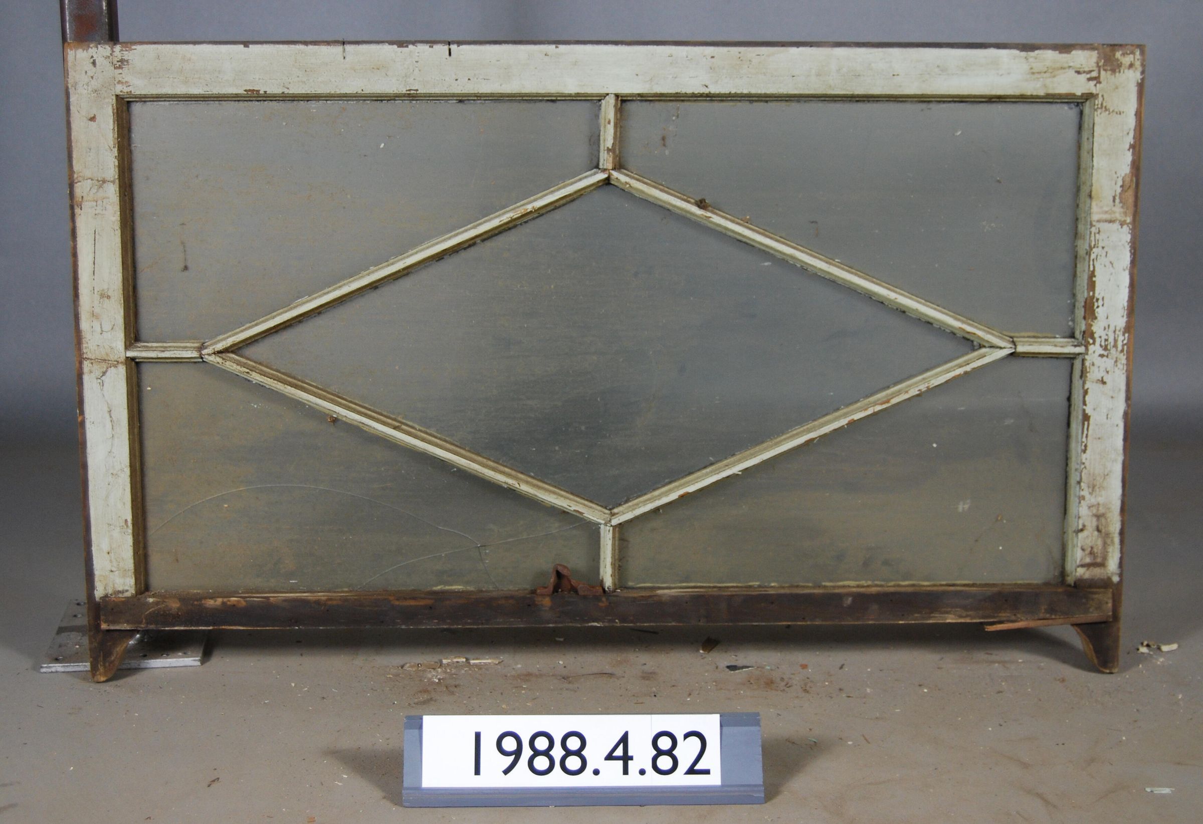 Rectangular. Mortice and tenon and coped joints. Five segmented openings. Central diamond shaped pane with four angular corner glass panes. Complete glass except one lower pane broken. Iron latch hardware. Ogee lugs.