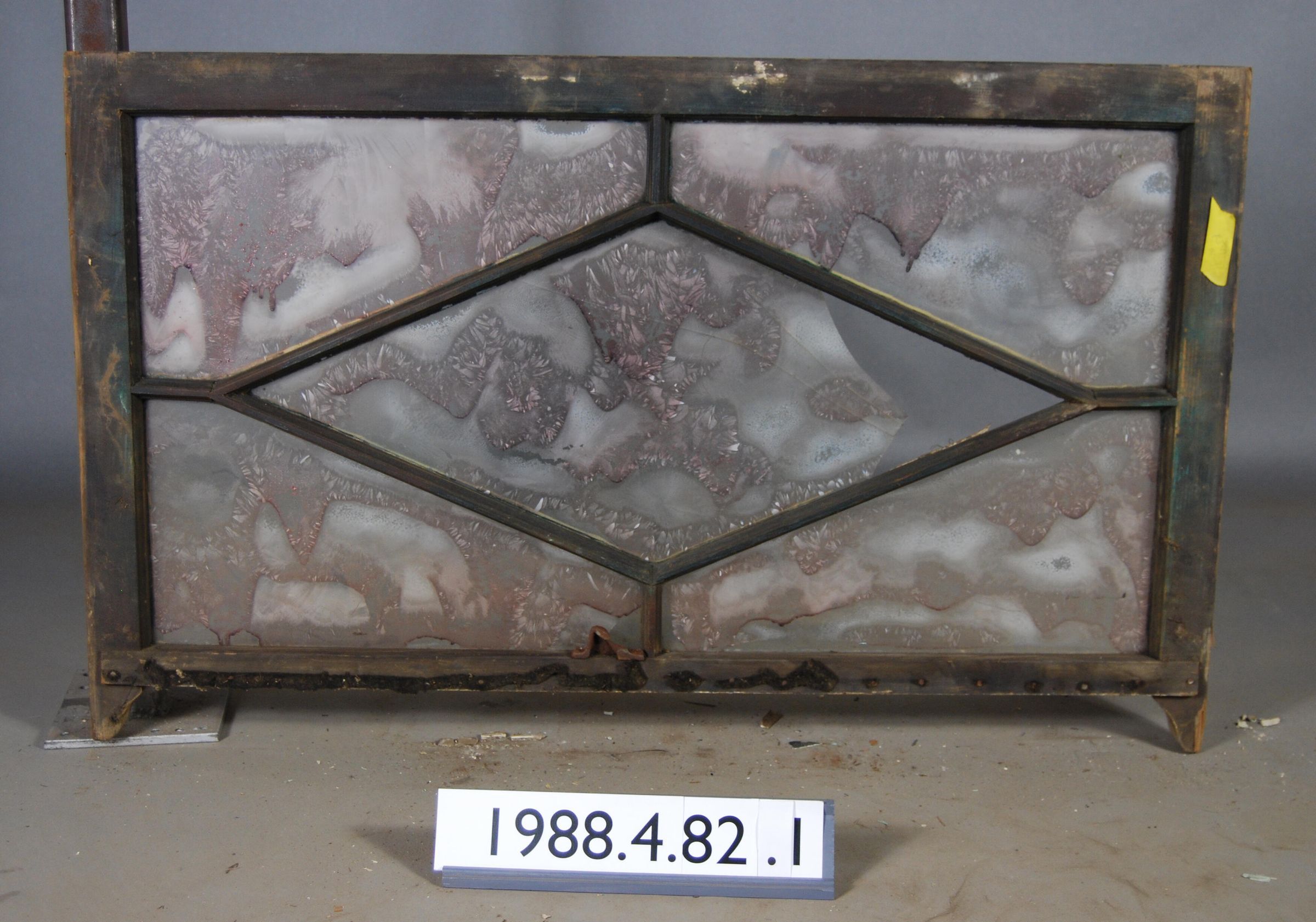 Rectangular. Mortice and tenon and coped joints. Five segmented openings. Central diamond shaped (broken) glass pane. Four angular corner complete glass panes. Iron latch hardware. Ogee lugs.