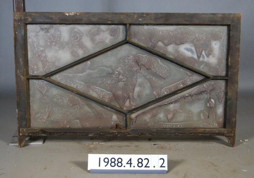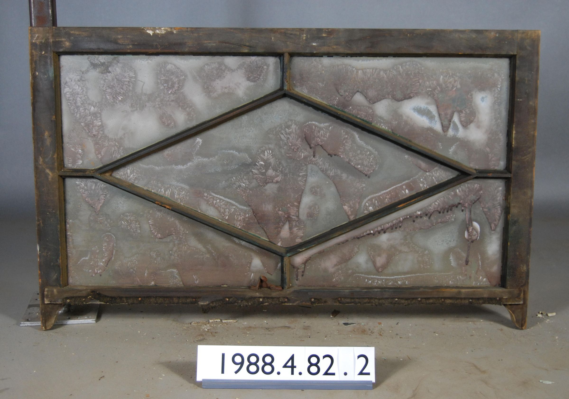 Rectangular. Mortice and tenon and coped joints. Five segmented openings. Central diamond shaped glass pane. Four angular corner panes. All glass complete. Iron latch hardware. Ogee lugs.