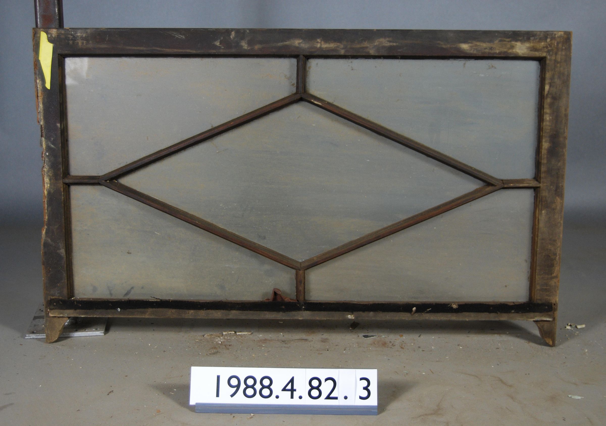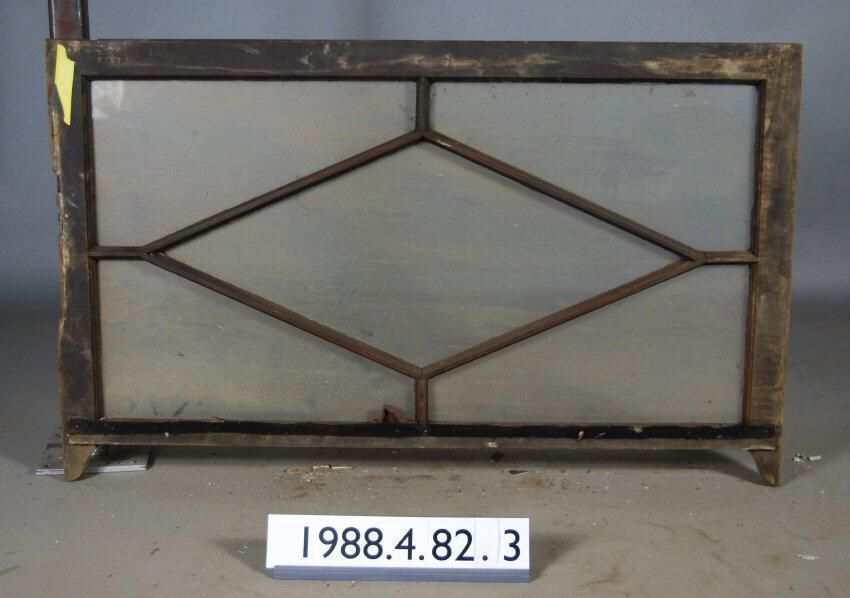 Rectangular. Mortice and tenon and coped joints. Five segmented openings. Central diamond shaped glass pane. Four angular corner panes. All glass complete. Iron latch hardware. Ogee lugs. One stile is decayed. Type: .Double hung top sash. Inscriptions or Markings: Manufacturer: Place of Manufacturer: Design motif: Style: Finish: Painted.