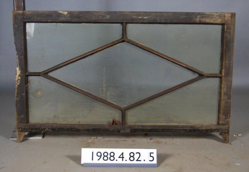 Rectangular. Mortice and tenon and coped joints. Five segmented openings. Central diamond shaped glass pane. Four angular corner panes. All glass complete. Iron latch hardware. Ogee lugs. One stile is decayed. Type: .Double hung top sash. Inscriptions or Markings: Manufacturer: Place of Manufacturer: Design motif: Style: Finish: Painted.