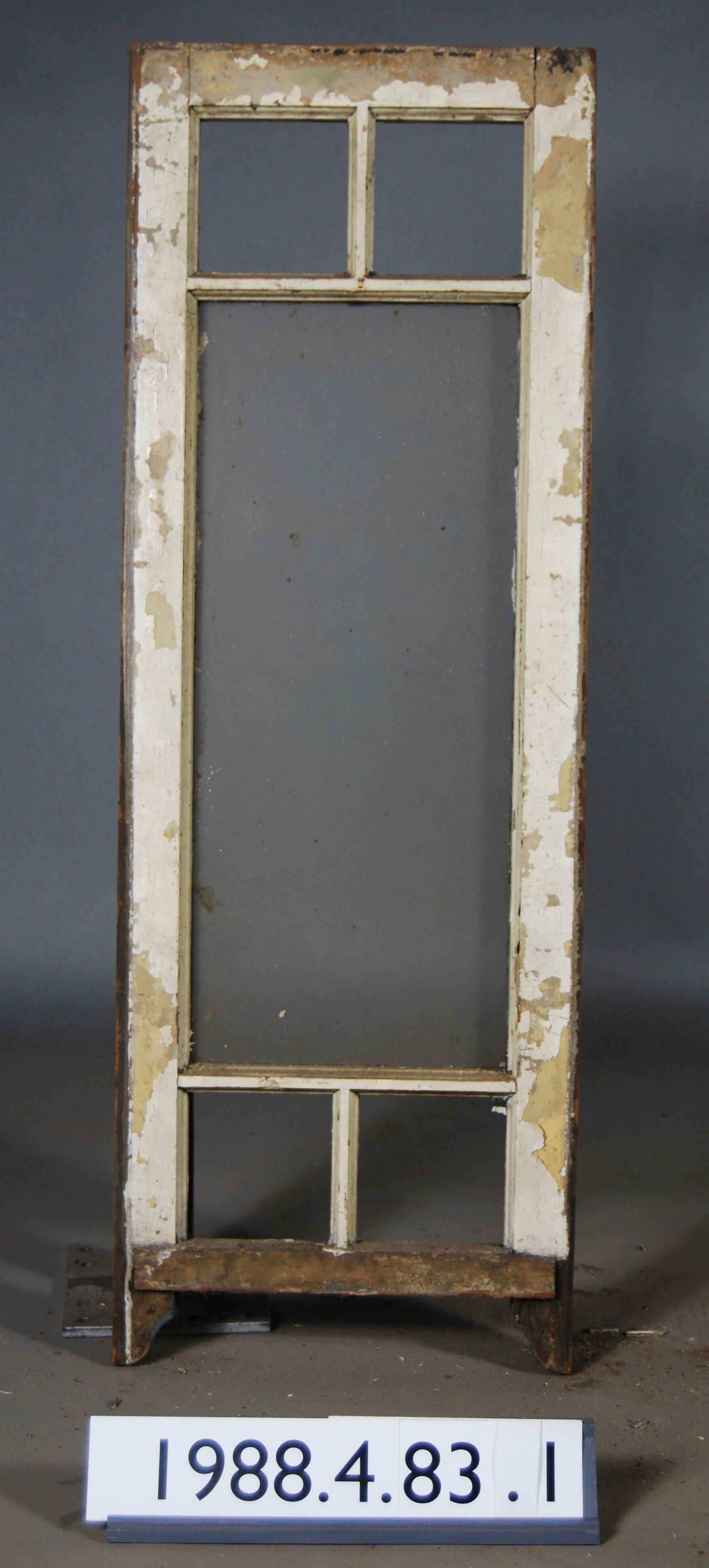 Rectangular. Mortice and tenon and coped joints. Segmented central rectangular opening with complete glass pane and two smaller openings above and two below. All smaller panes missing. Ogee lugs.