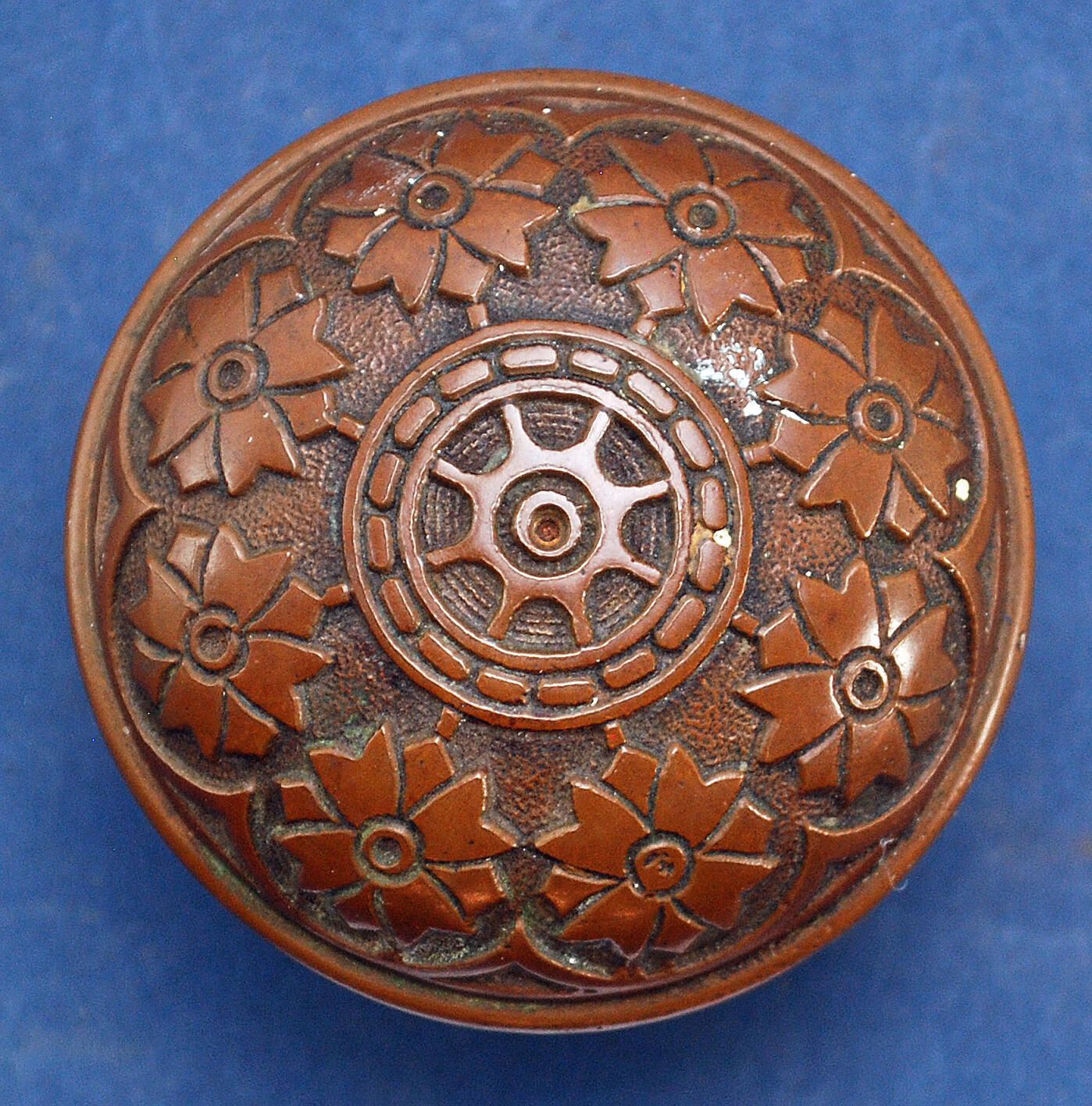 Design Name: Manufacturer: Hopkins & Dickinson Mfg. Co. Style: Aesthetic Material: Bronze Manufacturing Method: Wrought / Stamped Surface Finish: Aged / Unpolished VDA Classification: K 213 VDA Number: Shape: Domed Patent Specifics: Lock Type (If Applicable): Inscription/Makers Mark: Inscription Text: "1950 223" Comments: