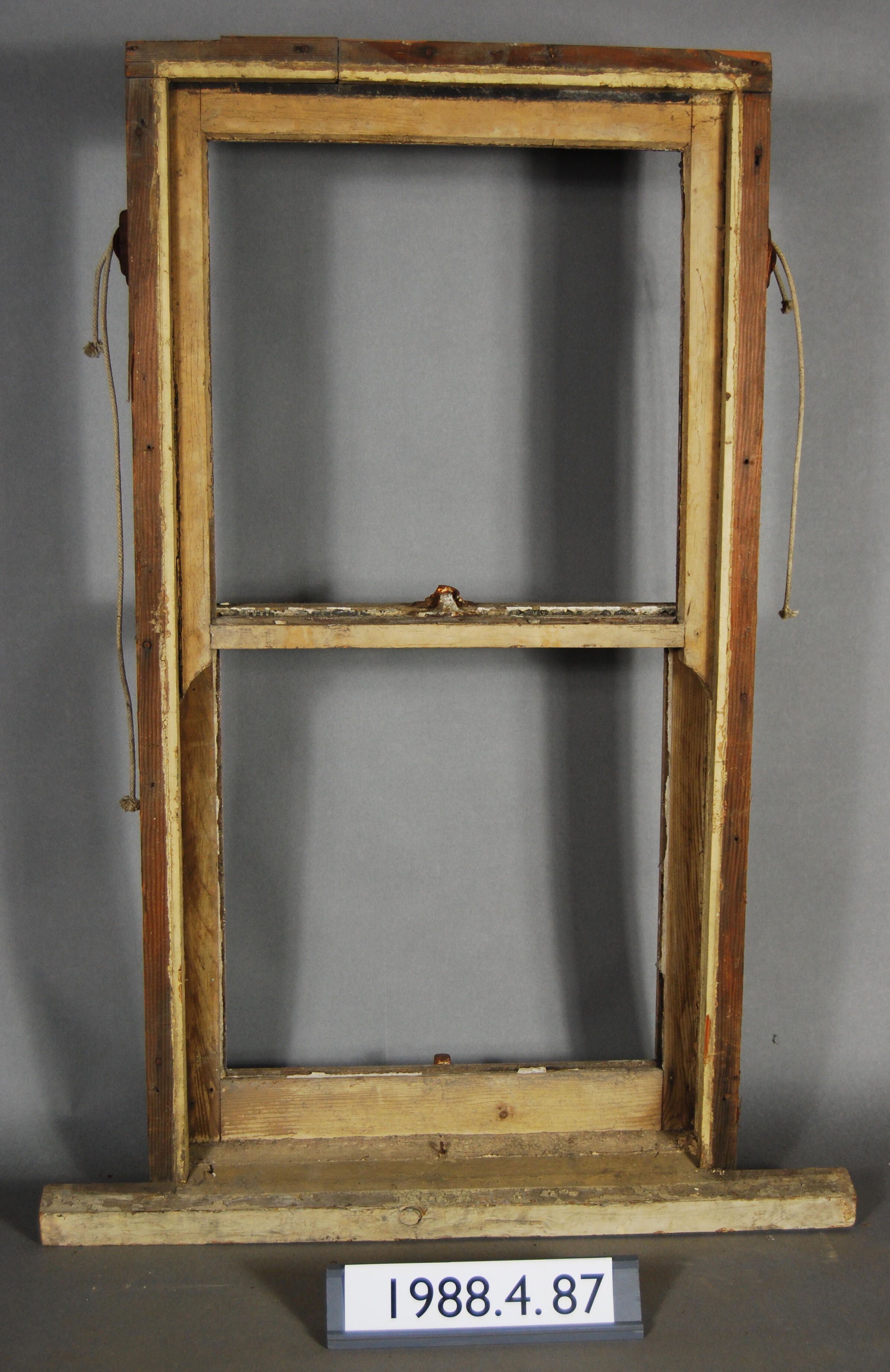 Rectangular. Window frame. Rectangular top sash. Mortice and tenon and coped joints. Glass pane missing. Ogee lugs. Rectangular bottom sash. Glass pane missing. Latch hardware. Type: Double hung . Inscriptions or Markings: Manufacturer: Place of Manufacturer: Design motif: Style: Finish: Painted.