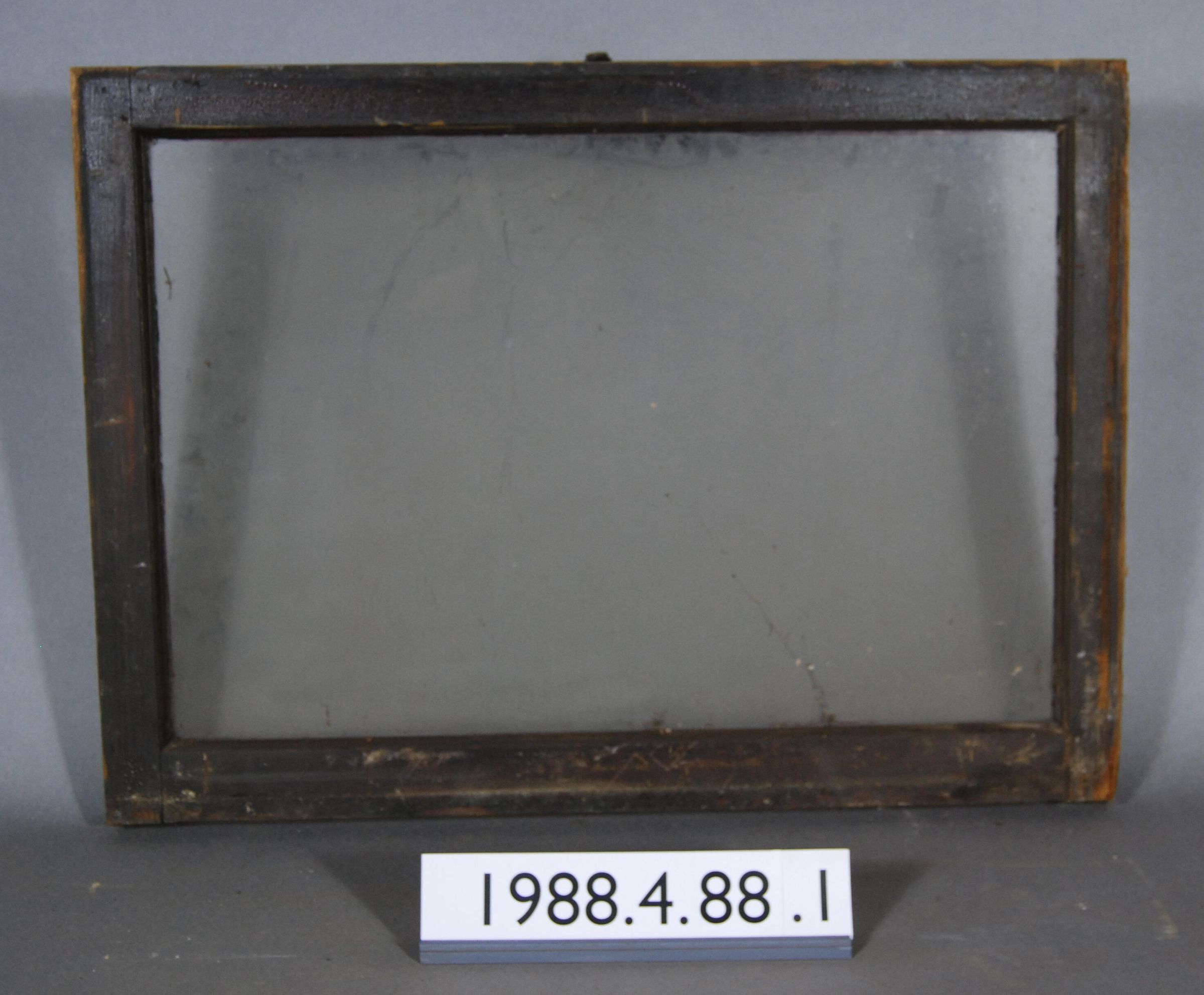 Rectangular. Mortice and tenon and coped joints. Complete glass pane. Double hung bottom sash fits in frame 1988.4.79, but short.