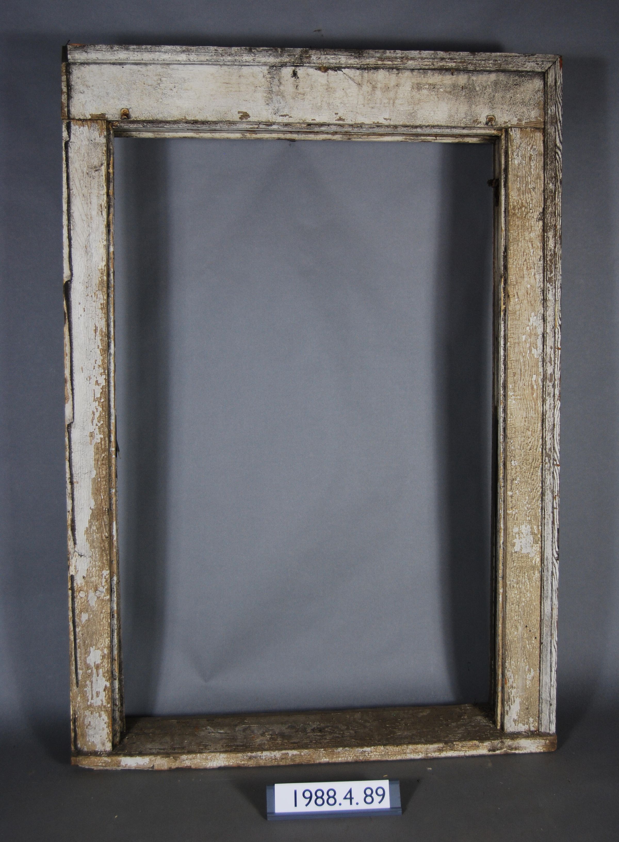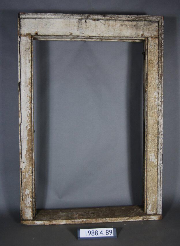 Rectangular. Window frame. both top and bottom sash missing. Has steel sash weight pulleys. Casings. Trim moldings. Constructed with wire nails.