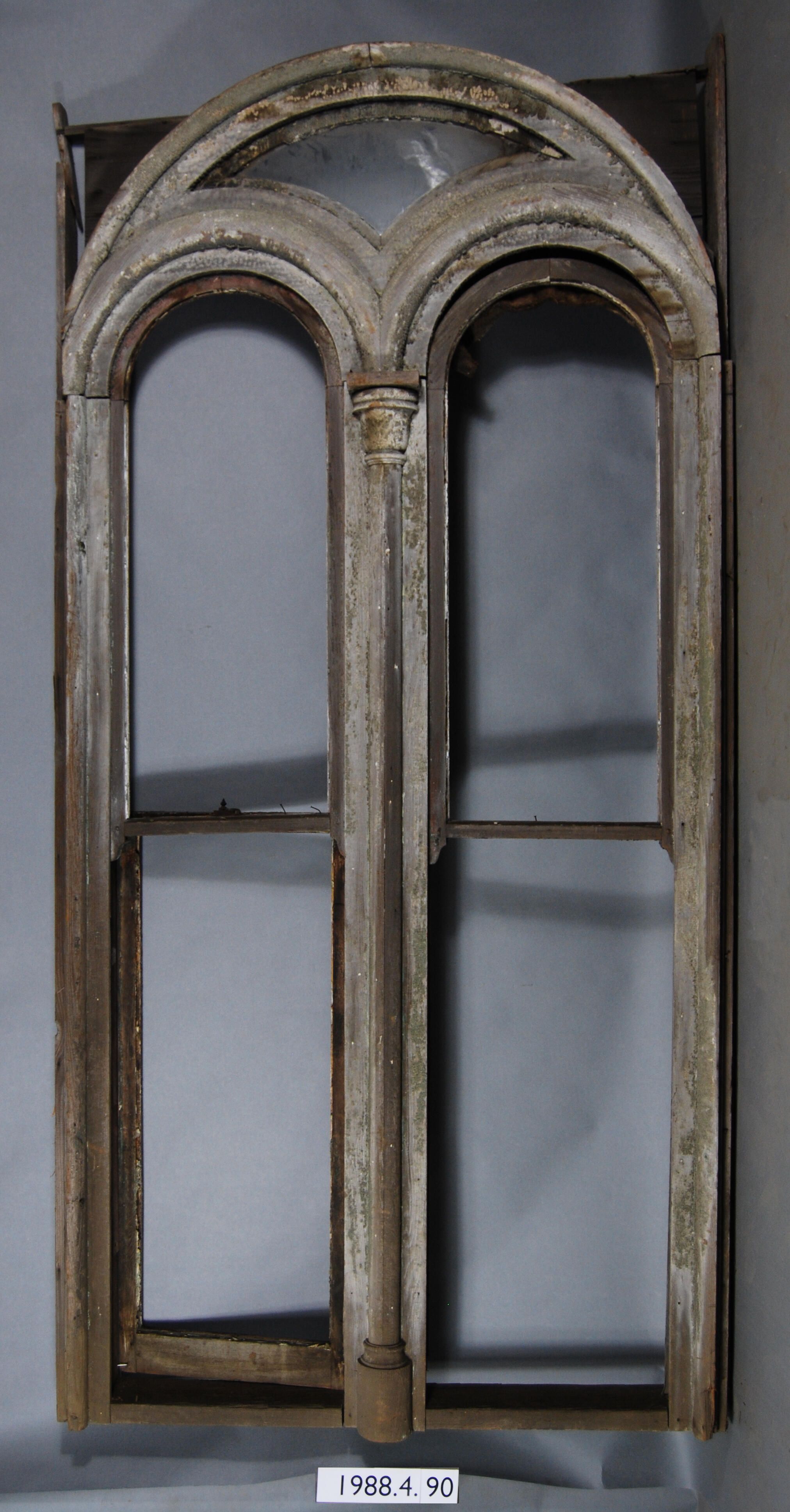 Rectangular. Window frame. Semi-circular top. Small arched window with glass pane at top. Frame has dual double hung sash. Upper sash has semi-circular tops. Glass panes missing. One sash has latch hardware. Each top sash has ogee lugs. One corner rectangular sash extant with complete glass pane. Other lower sash is missing. Casings surround front of frame. Has half round column with capital and base at center between sash.