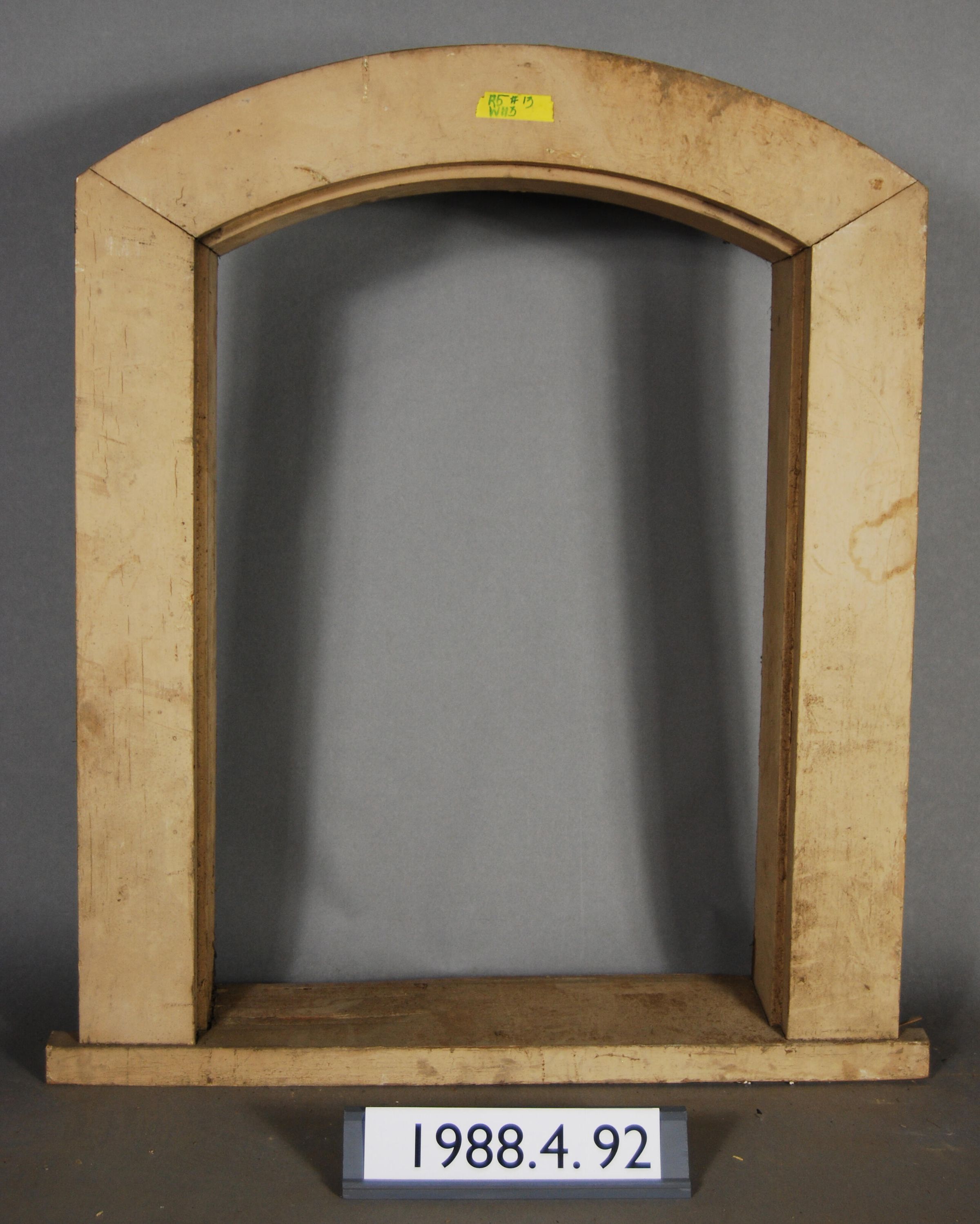 Semi-eliptical frame to fit fixed sash. (Sash is missing). Has casing with arched top mitred at corners. Joined with wire nails. Sill and side are decayed.