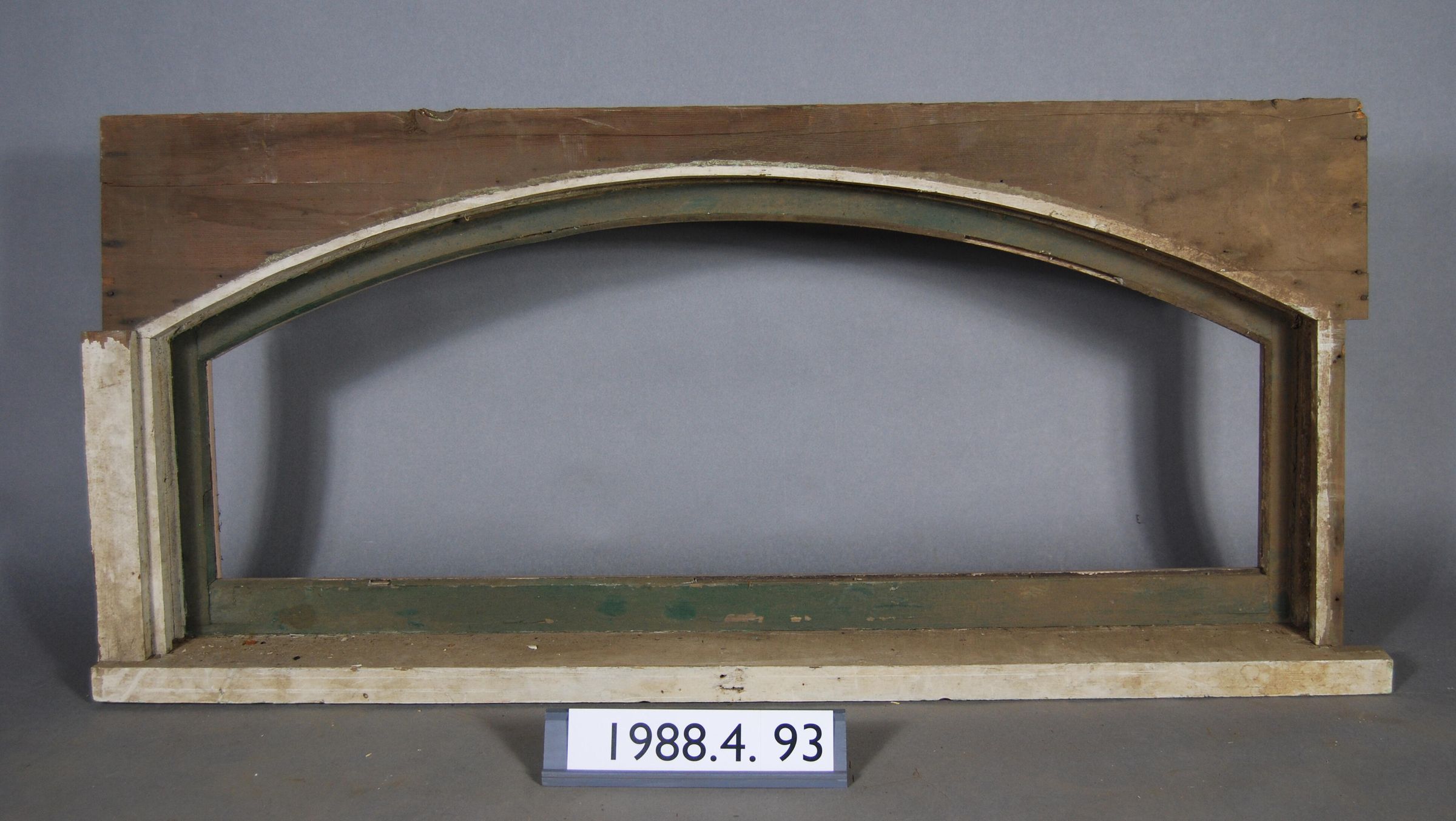 Rectangular. Frame with semi-eliptical opening. Has fixed semi-eliptical sash. Glass pane missing. Frame has sill. Incomplete casing. Type: Inscriptions or Markings: Manufacturer: Place of Manufacturer: Design motif: Style: Finish: Painted.