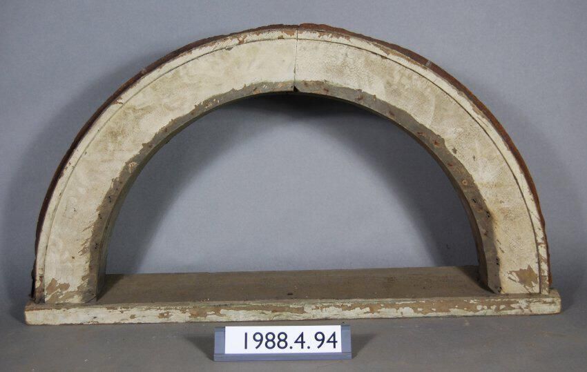 Semi-circular window frame originally fitted with hinged semi-circular sash. (Sash is missing). Frame has iron latch strike on interior. Semi-circular casing with iron flashing. Complete sill.