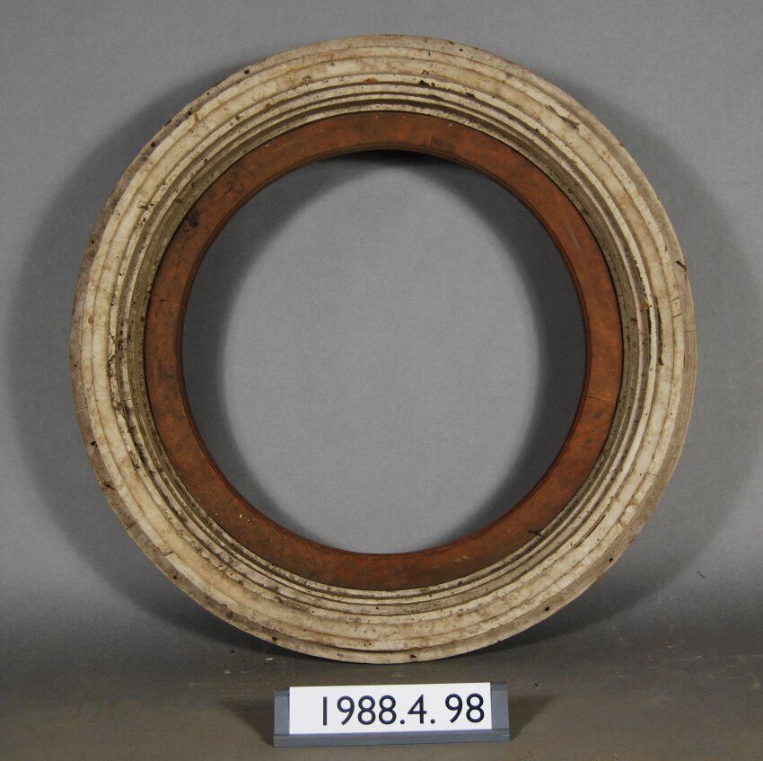 Circular window frame with circular-fixed sash. Sash appears to have never been glazed. Frame has circular complete casing. Inscription in crayon script on outside of frame: "STANTON."