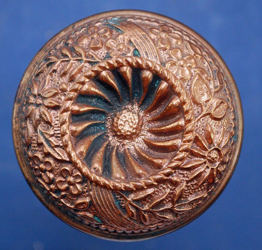 Design Name: Medley Manufacturer: Kenton Lock Co. Style: Aesthetic Material: Bronze Manufacturing Method: Wrought / Stamped Surface Finish: Unpolished VDA Classification: Asymmetric Design VDA Number: B 205 Shape: Sunken Center Patent Specifics: Lock Type (If Applicable): Inscription/Makers Mark: Inscription Text: Comments: Rusty Spindle