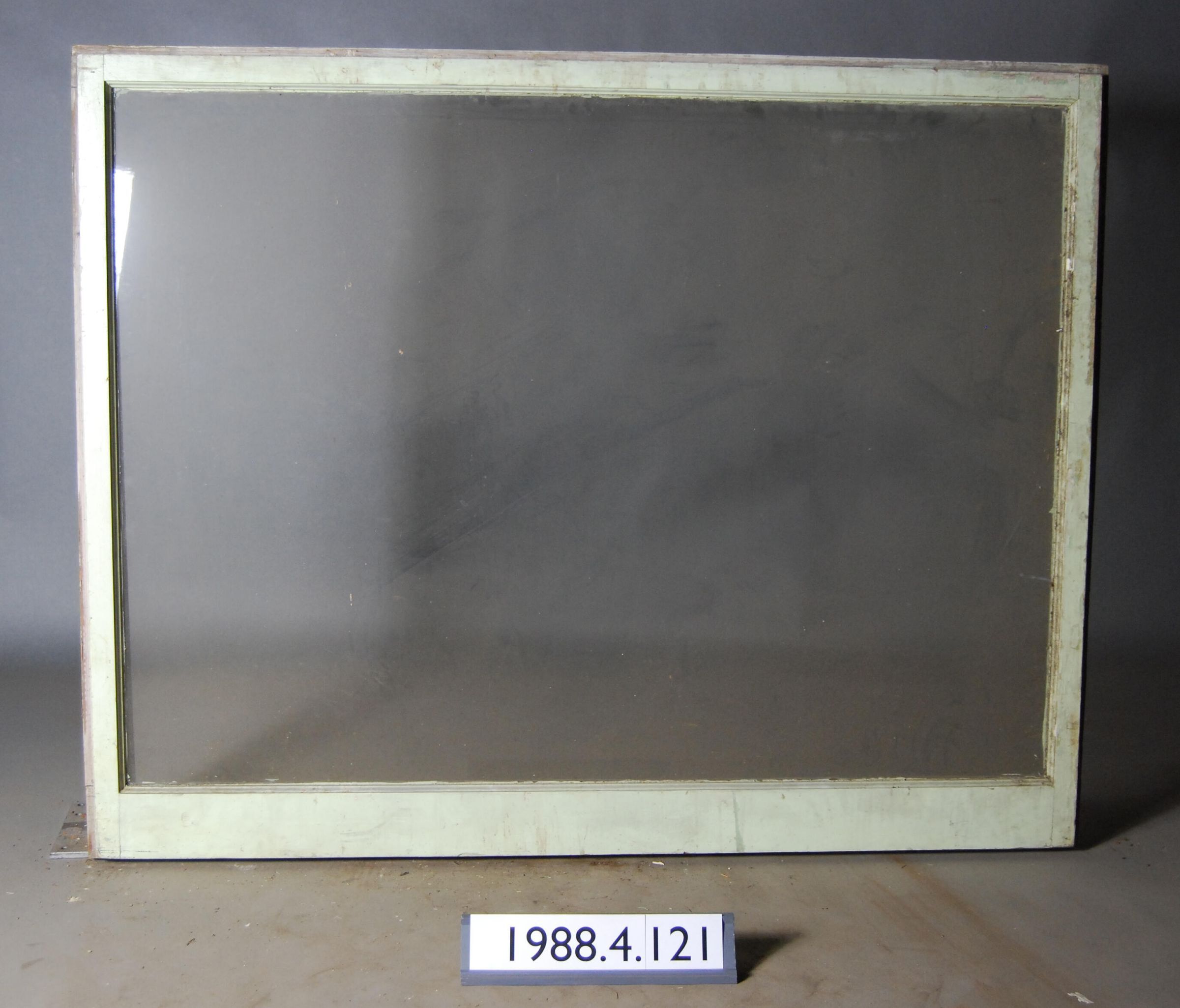 Rectangular. Mortice and tenon and coped joints. Complete glass pane Type: Fixed sash or storm window. Inscriptions or Markings: Manufacturer: Place of Manufacturer: Design motif: Style: Finish: Painted.