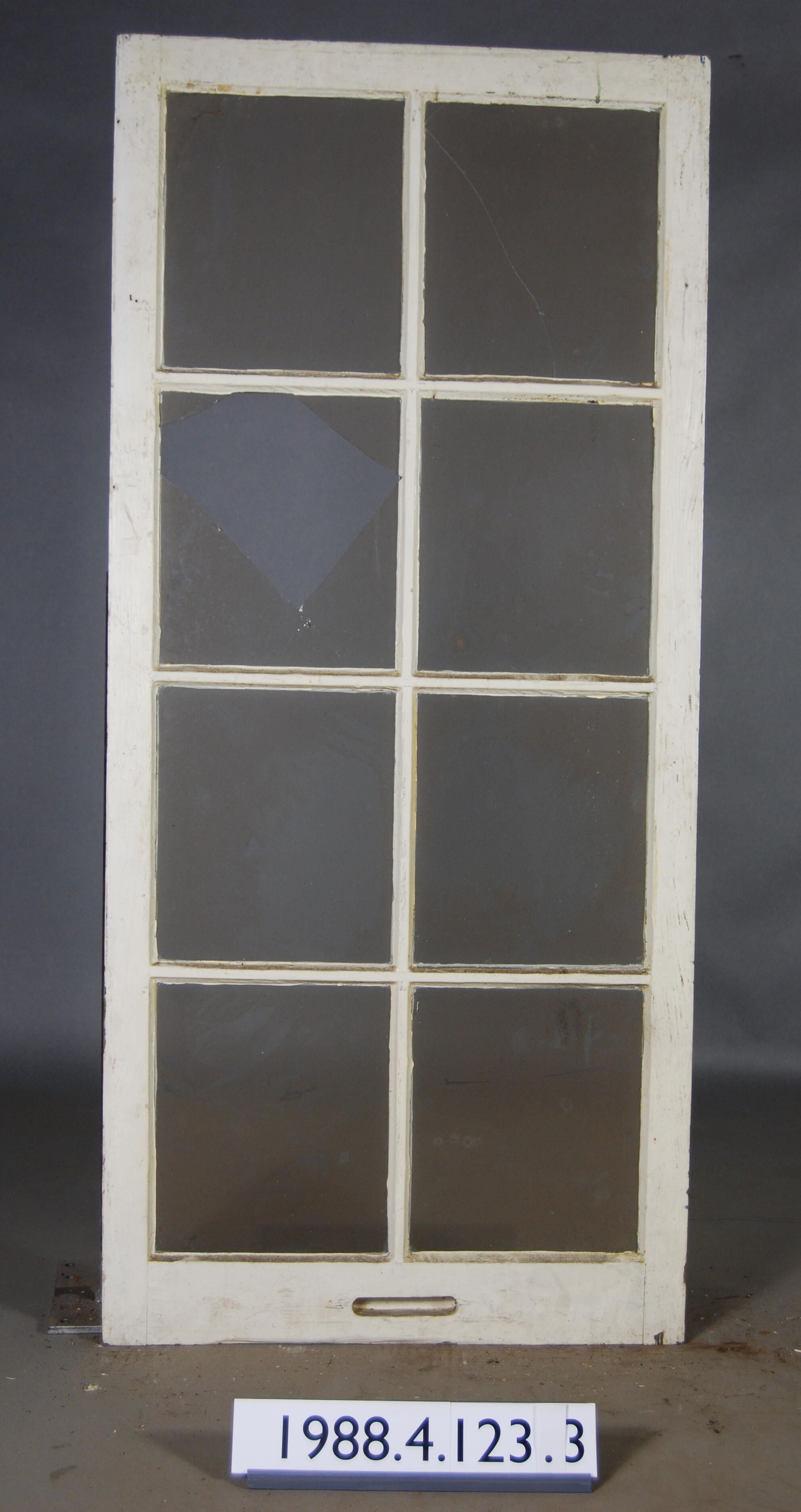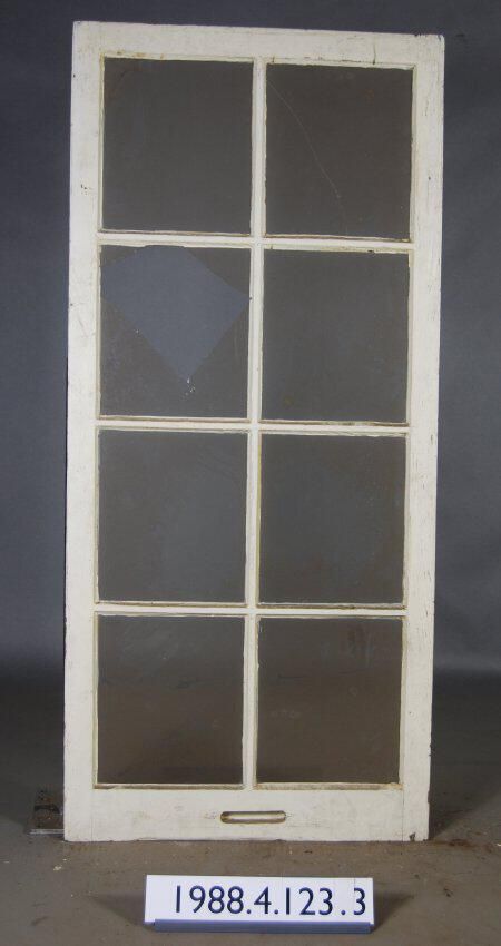Rectangular. Mortice and tenon and coped joints. Segmented eight openings. Six complete glass panes. Two broken panes. Sash is rabbeted around perimeter. Has recessed handle at bottom rail.