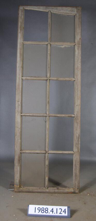 Rectangular. Mortice and tenon and coped joints. Segmented ten openings. Interior of top rail has "French" curve. Six complete glass panes. Four missing panes.