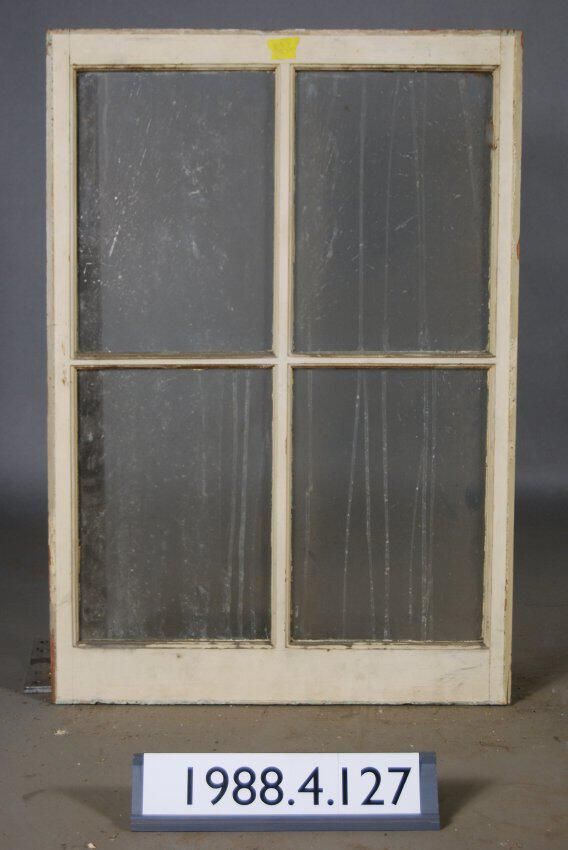 Rectangular. Mortice and tenon and coped joints. Segmented four openings. Three complete glass panes. One broken pane. Type: Fixed sash. Inscriptions or Markings: Manufacturer: Place of Manufacturer: Design motif: Style: Finish: Painted.