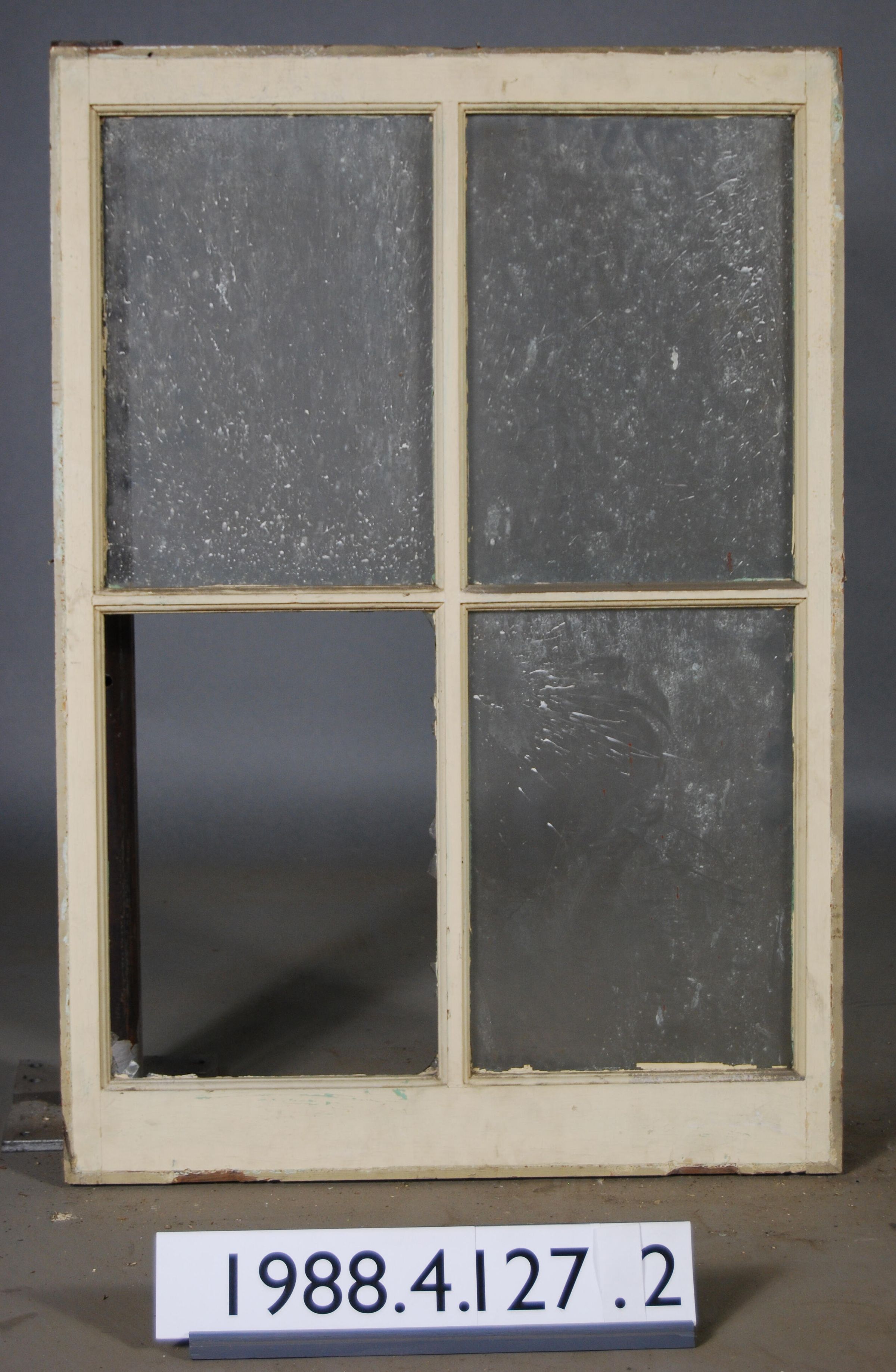 Rectangular. Mortice and tenon and coped joints. Segmented four openings. Three complete glass panes. One broken pane. Type: Fixed sash. Inscriptions or Markings: Manufacturer: Place of Manufacturer: Design motif: Style: Finish: Painted.